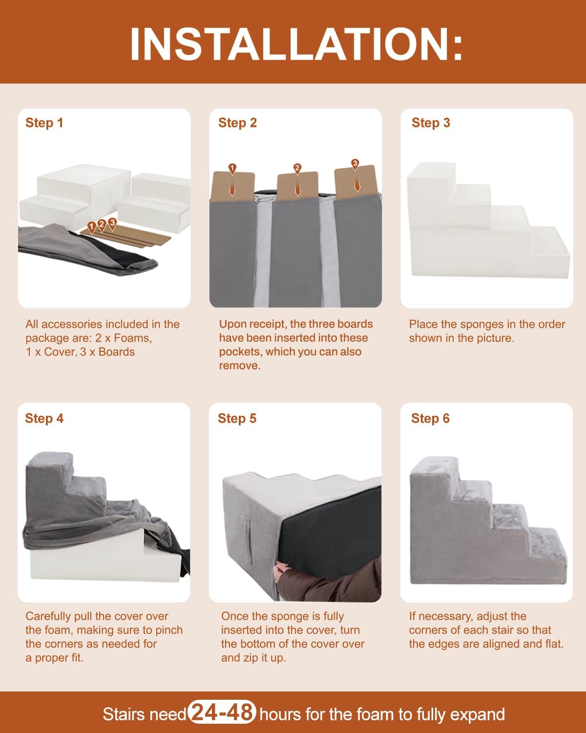 - CARE INSTRUCTION: After being compressed for a long period of time, the sponge may need some time to bounce back. Please allow at least 24 hours for it to fully expand. If you encounter any issues with the dog stairs, please contact us immediately. We will do our best to assist you in finding a solution.