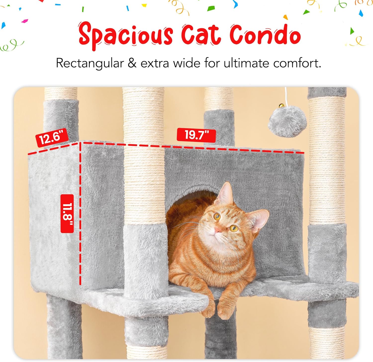 - Coziness and Amusement: Our 77 inches tall cat tree combines entertainment and functionality. Equipped with two padded perches, an extra-large cat condo, scratching posts, and interactive toys