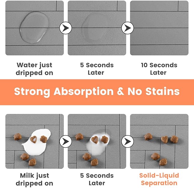 - 【Strong Absorbent & Stain-Resistant】Our dog food mat boasts exceptional absorbency, quickly soaking up any spilled water & milk and leaving no traces behind. It effectively prevents wet paws and keeps your pet's eating area clean.