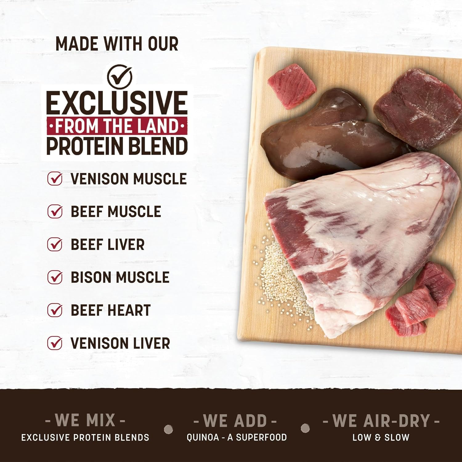 - EXCLUSIVE PROTEIN BLEND: Venison, beef, beef liver, bison, beef heart, & venison liver. Enriched with quinoa