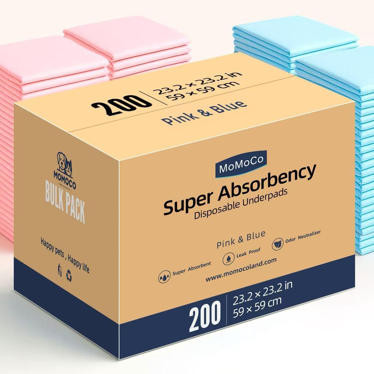 MoMoCo Value Pack Puppy Training Pads 23"x23", 200 Count (Blue100 + Pink100) – Leak-Proof & Super Absorbent Potty Pads for Dogs, Cats & Rabbits