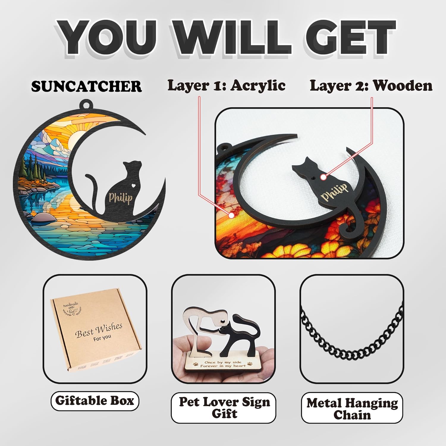 - Package Includes: 1 Memorial Suncatcher Cat comes with a long iron chain, 1 Pet Lover Sign Gift, 1 Gift Box. Painstakingly designed with profound care and meticulous attention to detail, this personalized cat memorial ornament holds profound meaning as a treasured keepsake for those who hold their beloved pets close to their hearts.