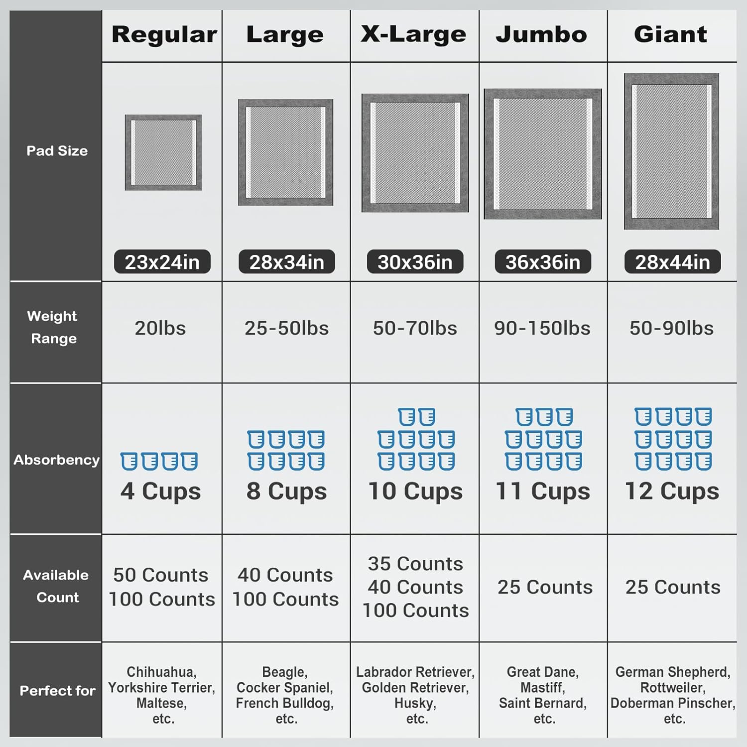 - Size and Absorbency Options: Available in 23 x 24 inches (4 cups), 28 x 34 inches (8 cups), 30 x 36 inches (10 cups), 36 x 36 inches (11 cups), and 28 x 44 inches (12 cups) to meet different needs; choose the size based on your pet's absorbency requirements for optimal use