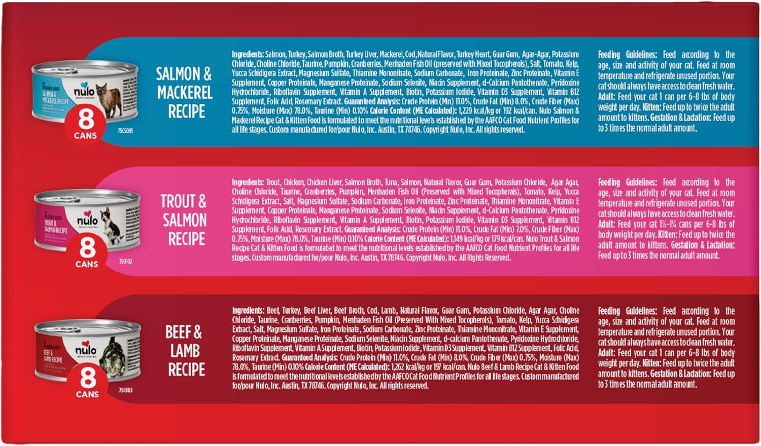 - Nulo Cat GF Salmon Trout Beef Variety Pack - 5.5 oz. - 3 Flavors - Salmon & Mackerel, Trout & Salmon, and Beef & Lamb (24 Cans Total)