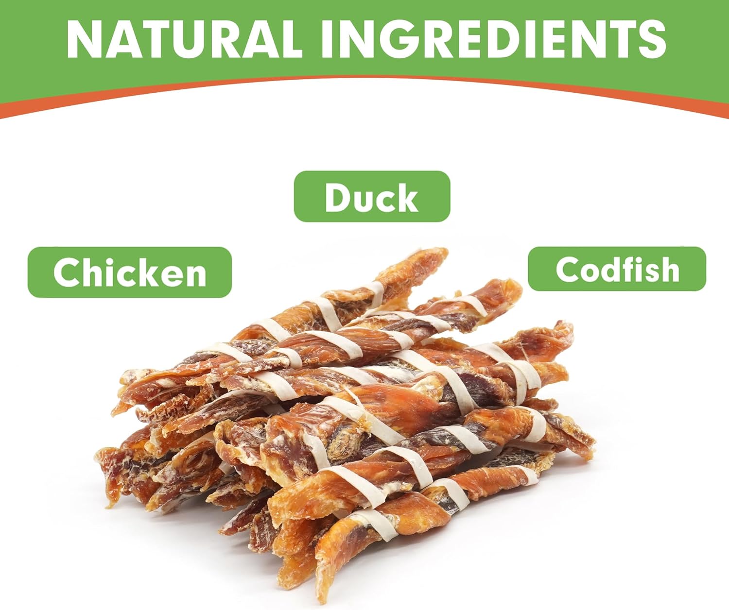 MON2SUN Dog Treats, Triple Flavor Jerky Twist Sticks, 5-7 Inch Chicken Duck and Codfish Sticks Chews for Small Dogs, Healthy Snacks, 17.64 oz (25 Count-Pack of 1)