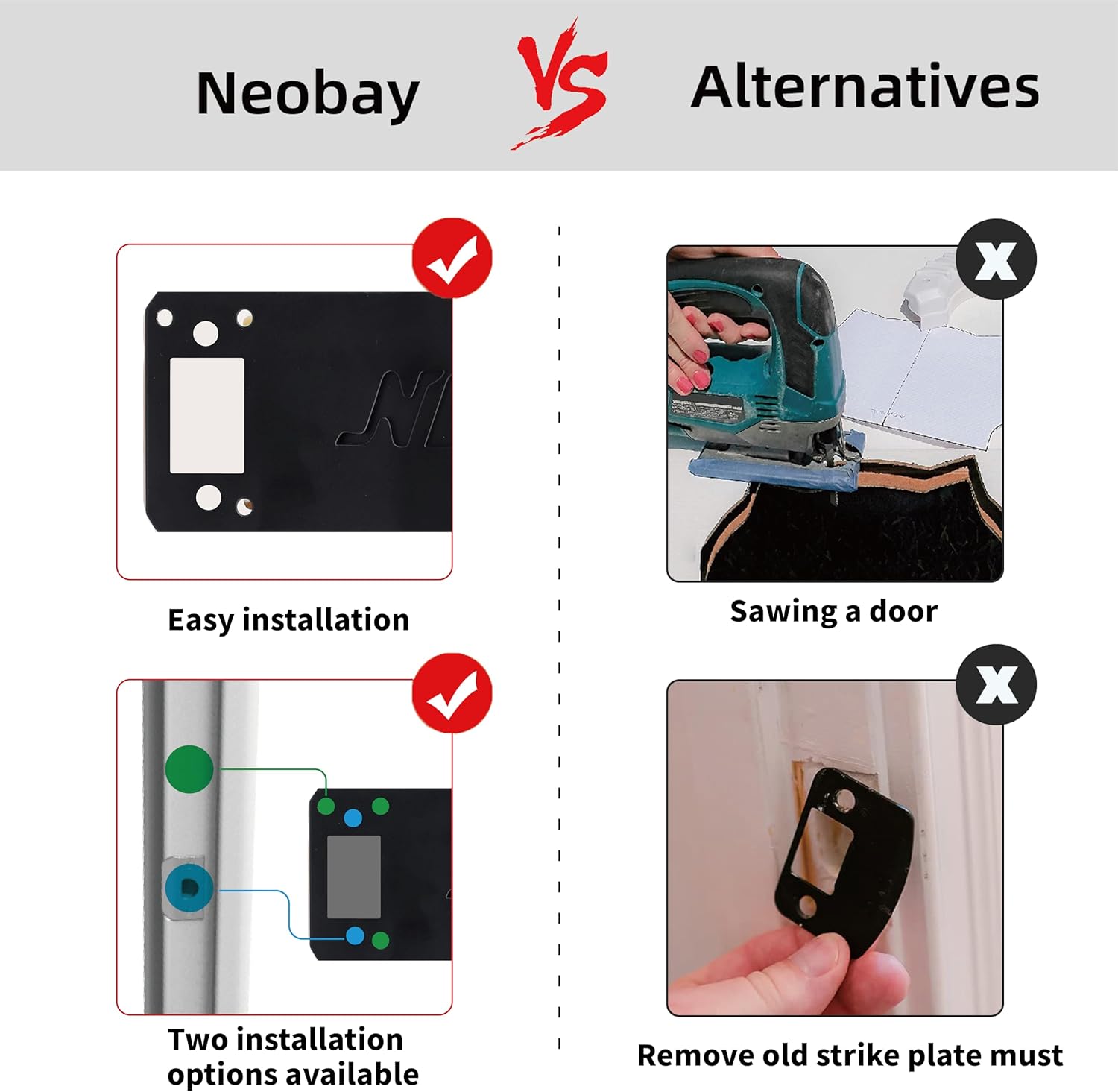 - Two Installation options available: 2 long screws for mounting neobay to door strike place (remove old door strike plate first)3 short screws for mounting neobay to the frame of the door ( 4 screws provided in the product package.) and Adjust the door opening gap width by 2 hand-tightened screws, No adhesive or cutting needed. Easy door latch for cats keep dogs out , Great alternative to baby gate with cat door.