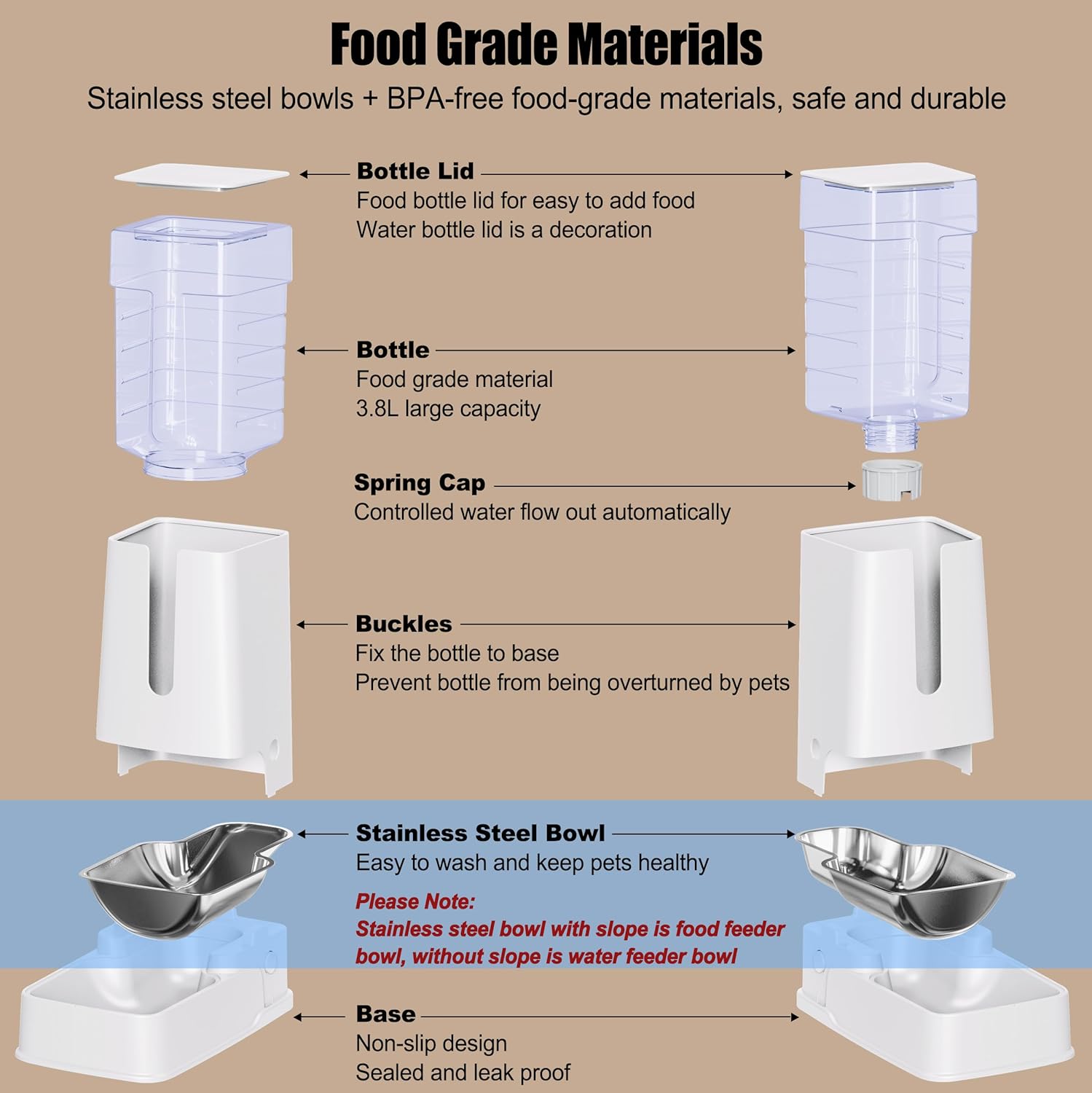 Automatic Cat Feeder and Cat Water Dispenser Set with Stainless Steel Bowls Gravity Dog Feeder for Small Medium Big Dog Pets Puppy Kitten, 3.8L x 2