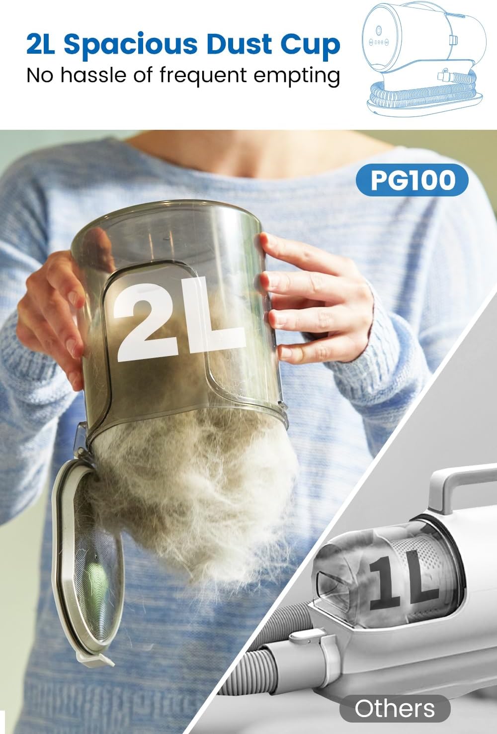- 2L Large Capacity Vacuum Container- Our dog hair vacuum features a generous 2L dust cup, providing ample space to contain pet hair, even for those with exceptionally furry dogs. This means less frequent emptying during pet grooming sessions. Additionally, its user-friendly design makes disassembly and cleaning effortless, enhancing overall convenience.