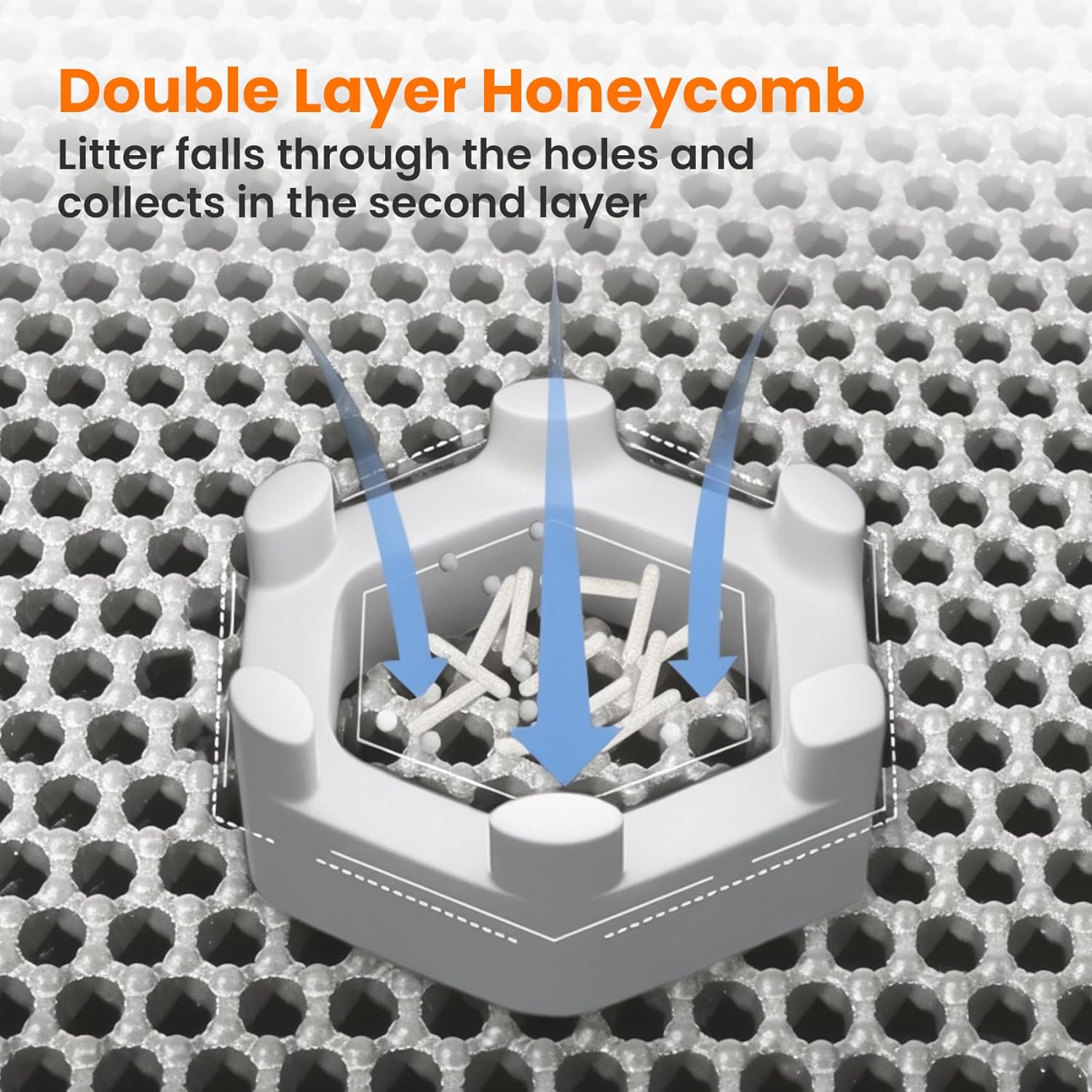 - Double Layer Honeycomb Structure: The top layer features holes that capture all kinds of litter, allowing it to fall through to the waterproof bottom layer for easy cleanup. Simply pick up the mat, pour the trapped litter back into the box, and reuse it—mess-free and effortless. This clever design minimizes litter waste and streamlines your daily cleaning routine.