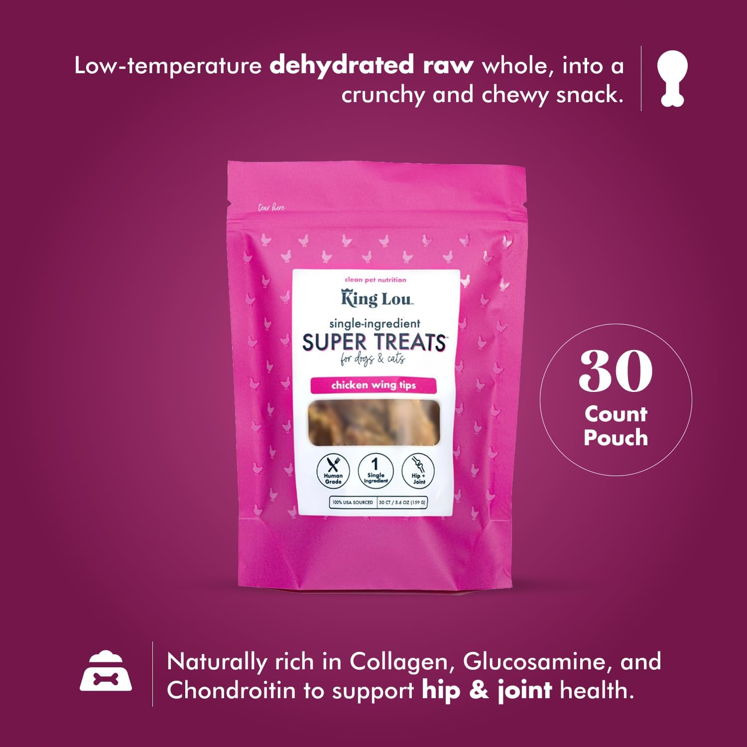 King Lou Pets - Whole Chicken Wing Tips - Dehydrated Raw Chicken Dog & Cat Treats - USA-Made - Rich in Collagen, Glucosamine, Chondroitin for Hip & Joint Health - 30 Count