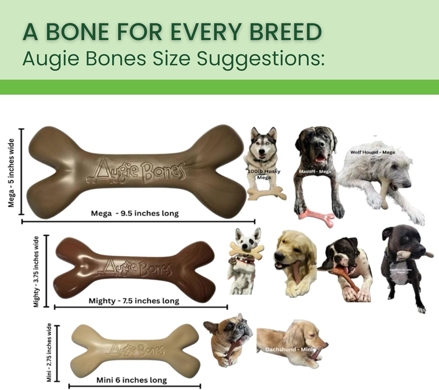 - ALL TOUGH CHEWERS, ALL AGES: Augie Bones are the best tough dog toys for aggressive chewers. They’re engineered to withstand the toughest chewers. Their durable design and curved shape ensure hours of enjoyment, making them the perfect playmate for dogs. Paw-some, right? Note: The Mega is a very large toy. We named the Mega because its bigger than your average large, perhaps bigger than your average XL as well. Do not purchase this toy for dogs under 50lbs