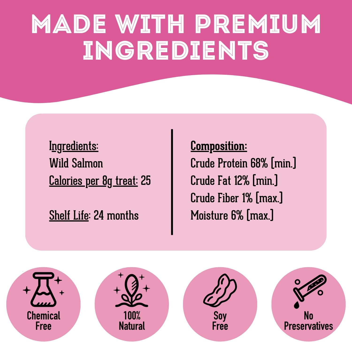 - DELIGHTFULLY UNMATCHED, IRRESISTIBLY UNIQUE FLAVOR - Give your pets the gift of an extraordinary, palate-pleasing experience with our salmon treats, lovingly crafted for both dogs and cats. In a league of their own, these treats offer a one-of-a-kind taste that's sure to make your furry friends come back for more. Unlike typical pet treats, our salmon treats not only tantalize their taste buds but also make the perfect small dog treats and large dog treats, ensuring satisfaction for all!