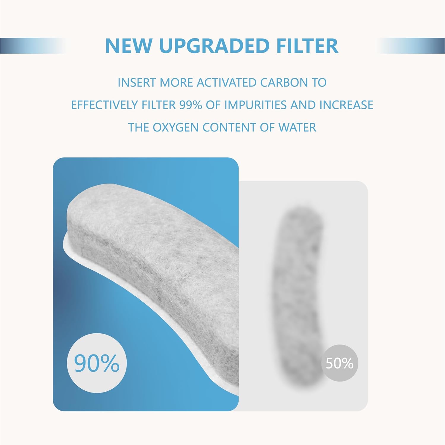 - [ MULTIPLE FILTRATION ] - The filters for dog water fountain is saturated filled with premium activated carbon and and non-woven fabric, fully isolate dog hair and food residue, remove impurities and particle, filter heavy metals and odors, soften tap water and obtain clean and fresh water, increases pet water intake, and maintains its health and vitality.