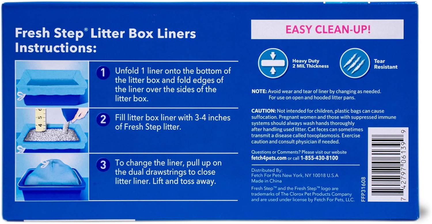- FITS MOST CAT LITTER BOXES UP TO 15” x 9” x 8” - These Fresh Step large litter box liners will fit most large litter pans and can conform to rectangular or oval shaped boxes, as well as covered or open boxes.