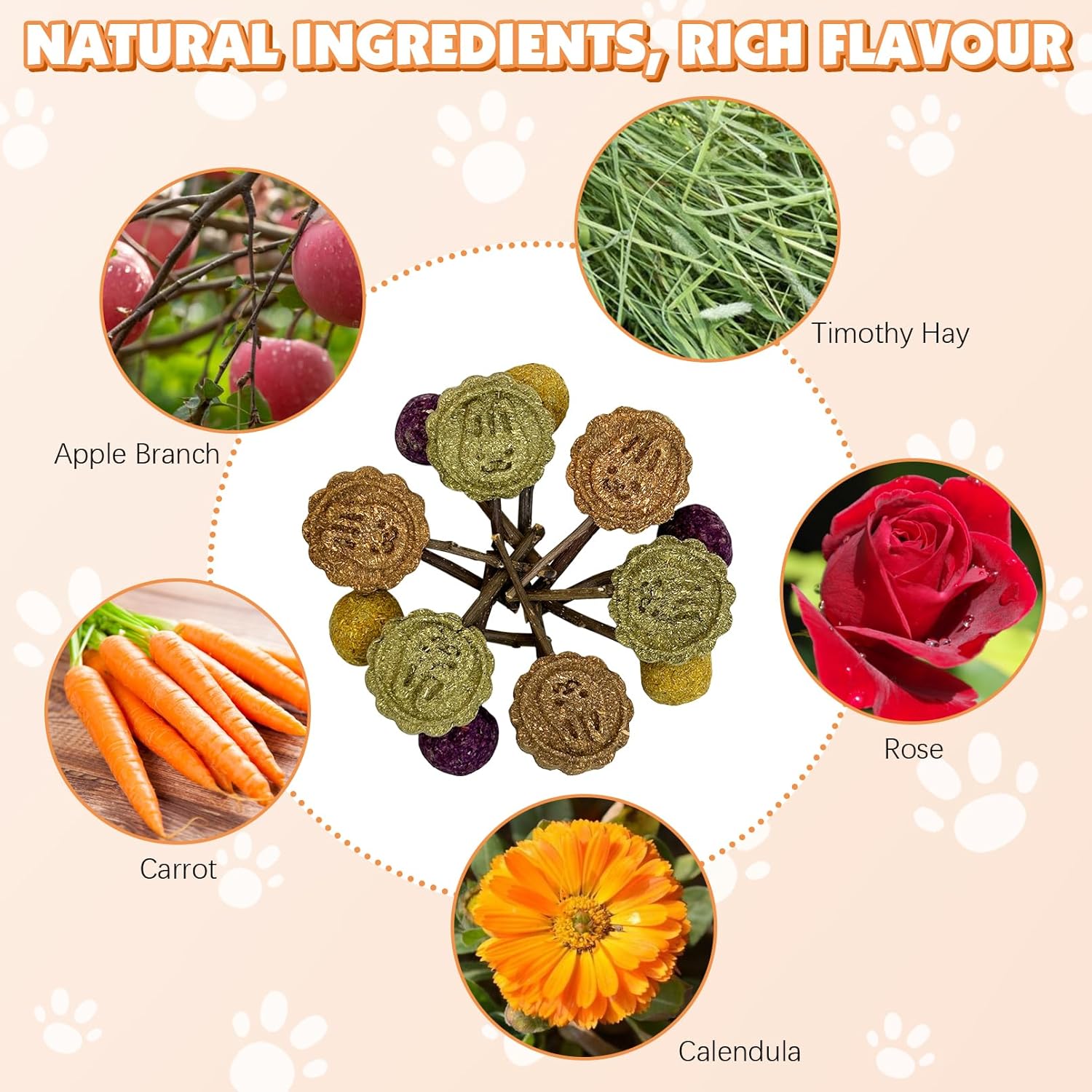 - 🐾 [Natural Ingredients]: Rabbit chew toys for teeth are made of apple branch, timothy hay, roses, calendula and carrots, which are rich in nutrients. The natural flavour attracts small animals to chew.
