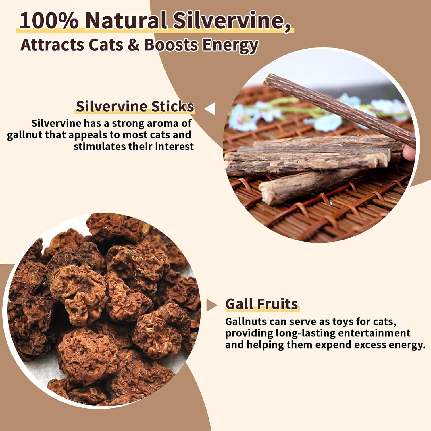 - Natural Silvervine for Happy & Healthy Cats: 100% natural silver vine sticks—no additives or preservatives! The irresistible gallnut flavor attracts cats, promotes digestion, and satisfies their natural urge to chew, kick, and play. A safe, enriching toy that keeps them entertained while supporting overall wellness.