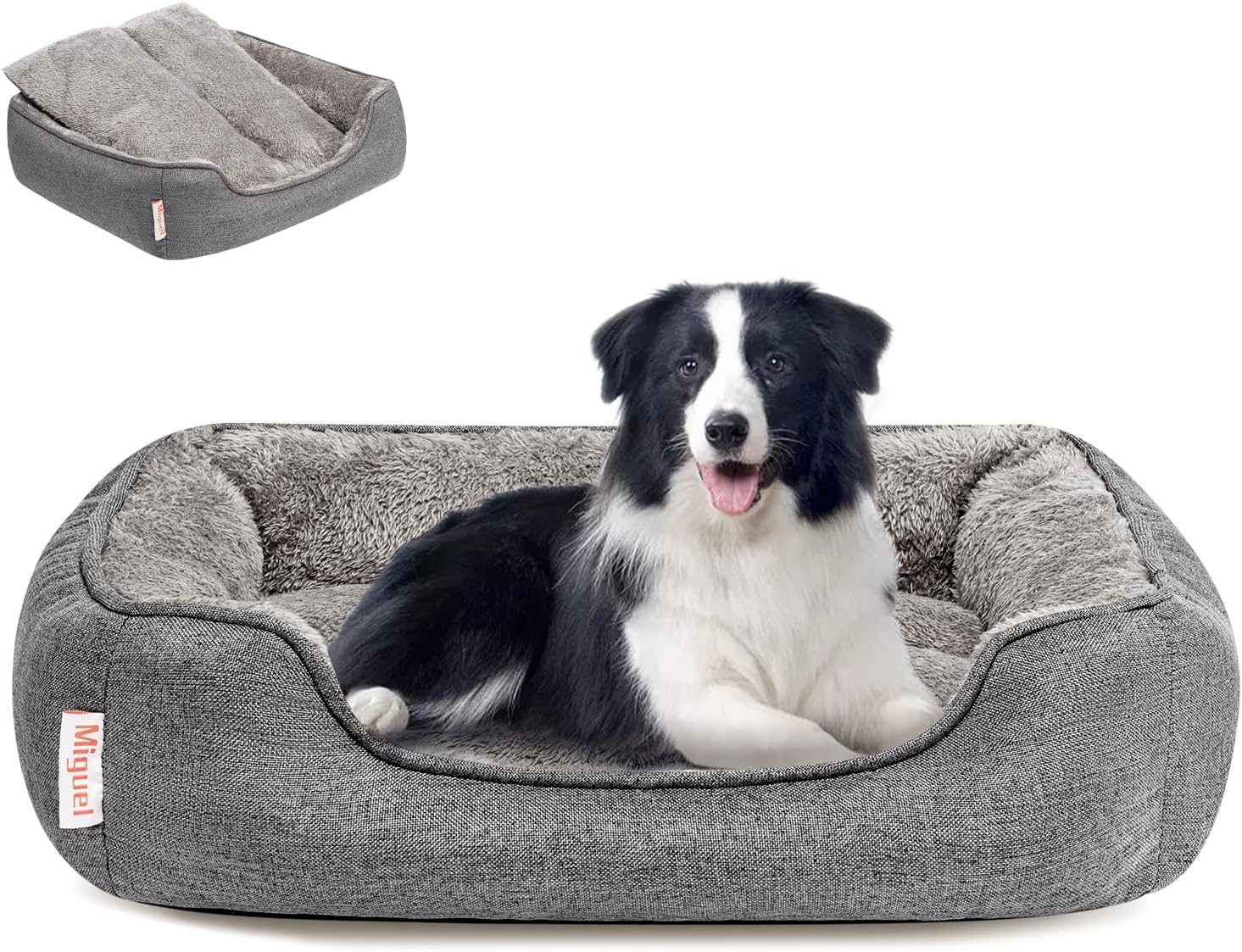 Miguel Faux Linen Dog Bed with Removable Cushion Pillow for Medium Small Dogs, Washable Pet Bed with Side Easy to Wash Puppy Bed, Rectangle Cat Bed for Indoor Cat with Anti-Slip Bottom, Gray 35 Inch