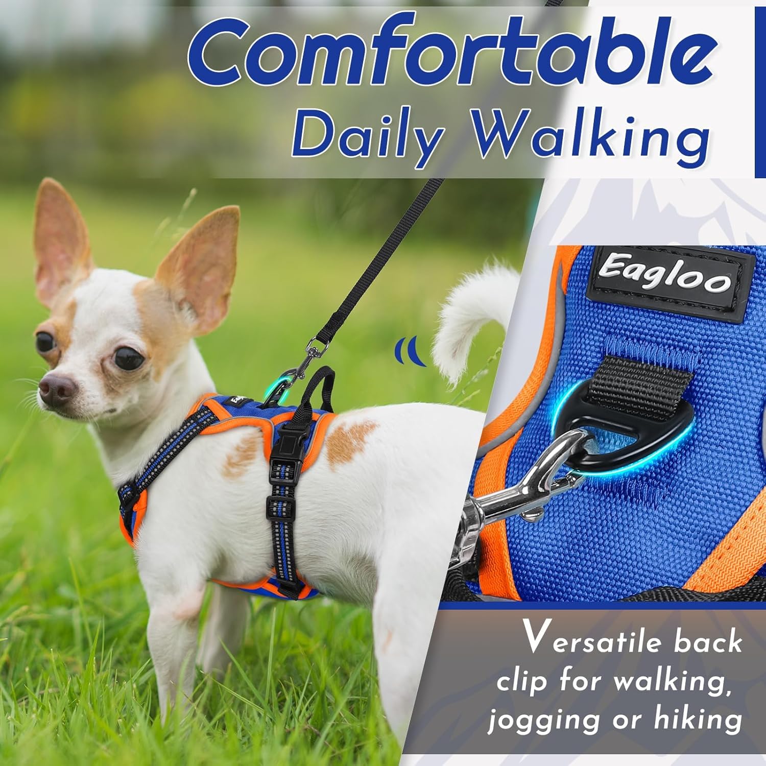 Eagloo Small Dog Harness No Pull, Service Vest with Reflective Strips and Control Handle, Adjustable and Comfortable for Walking, No Choke Pet Harness with 2 Metal Rings, Blue & Orange, XS