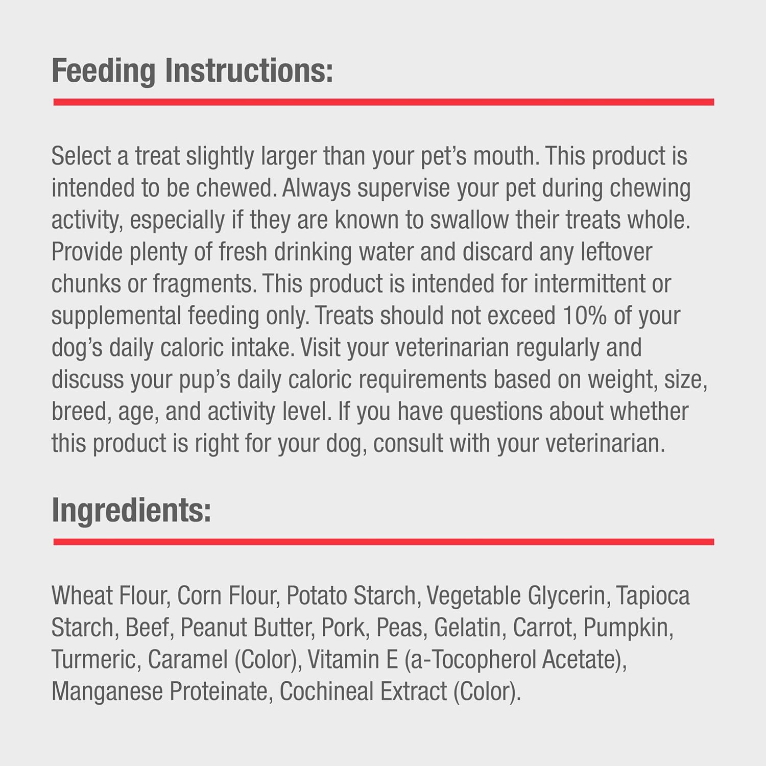 - NO CHICKEN ADDED: These 100% delicious, non-chicken chews are made with real beef, peanut butter, pork and vegetables for a scrumptious taste dogs can’t resist.