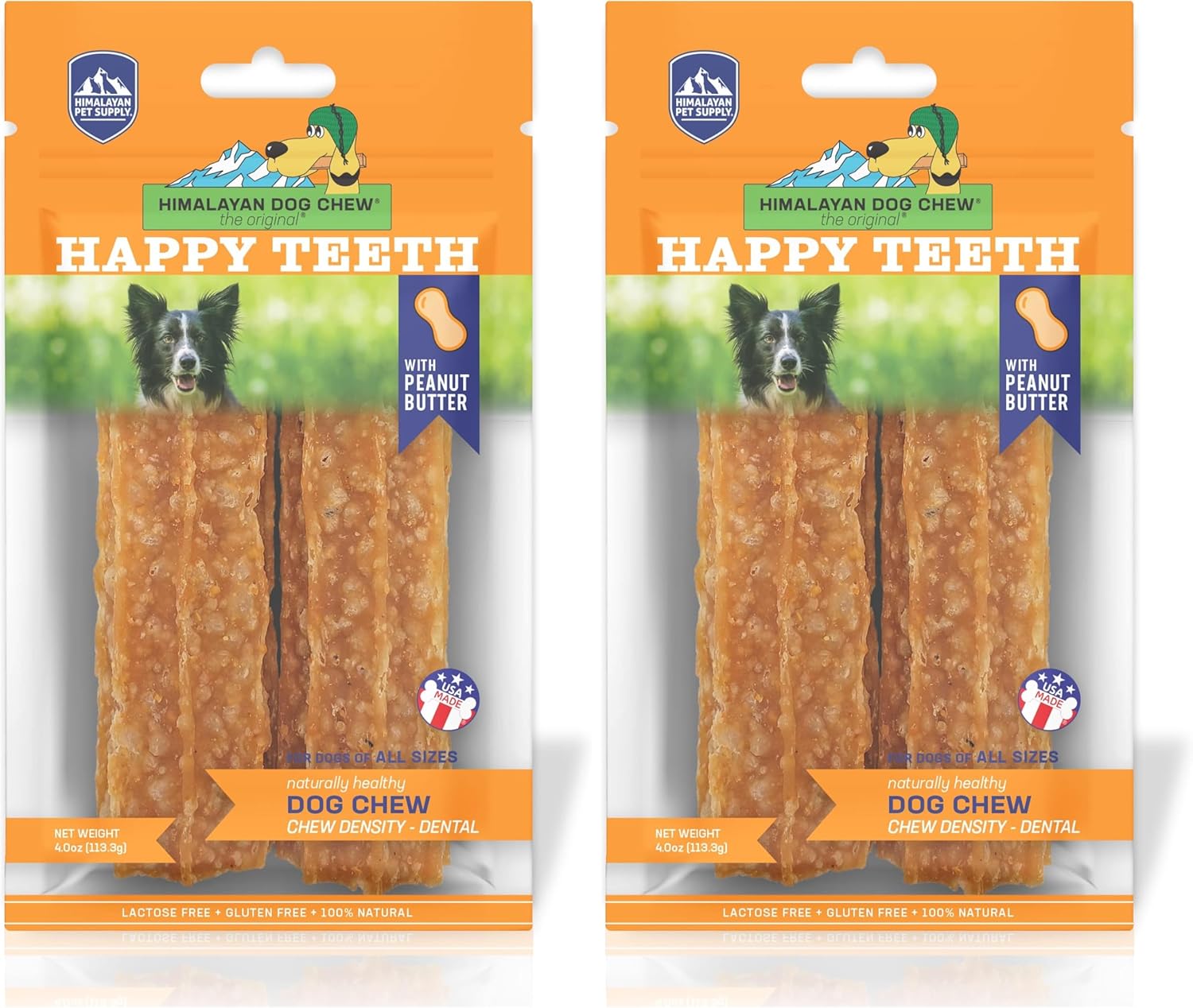 Happy Teeth Natural Cheese Dog Chews | Peanut Butter Flavor | Dental Chew | Protein Rich | Gluten Free - Lactose Free - Wheat Free - Soy Free | 2 Happy Teeth Chews per Resealable Pouch (Pack of 2)