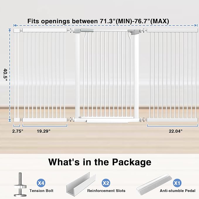 40.55" Extra Tall Baby Gate for Stairs-71.3"-76.7" Wide 1.37" Ultra Narrow Spacing Extra Wide Pet Cat Gate Dog Gate-Auto-Close Pressure Mounted Dog Door for Pets and Kids,White