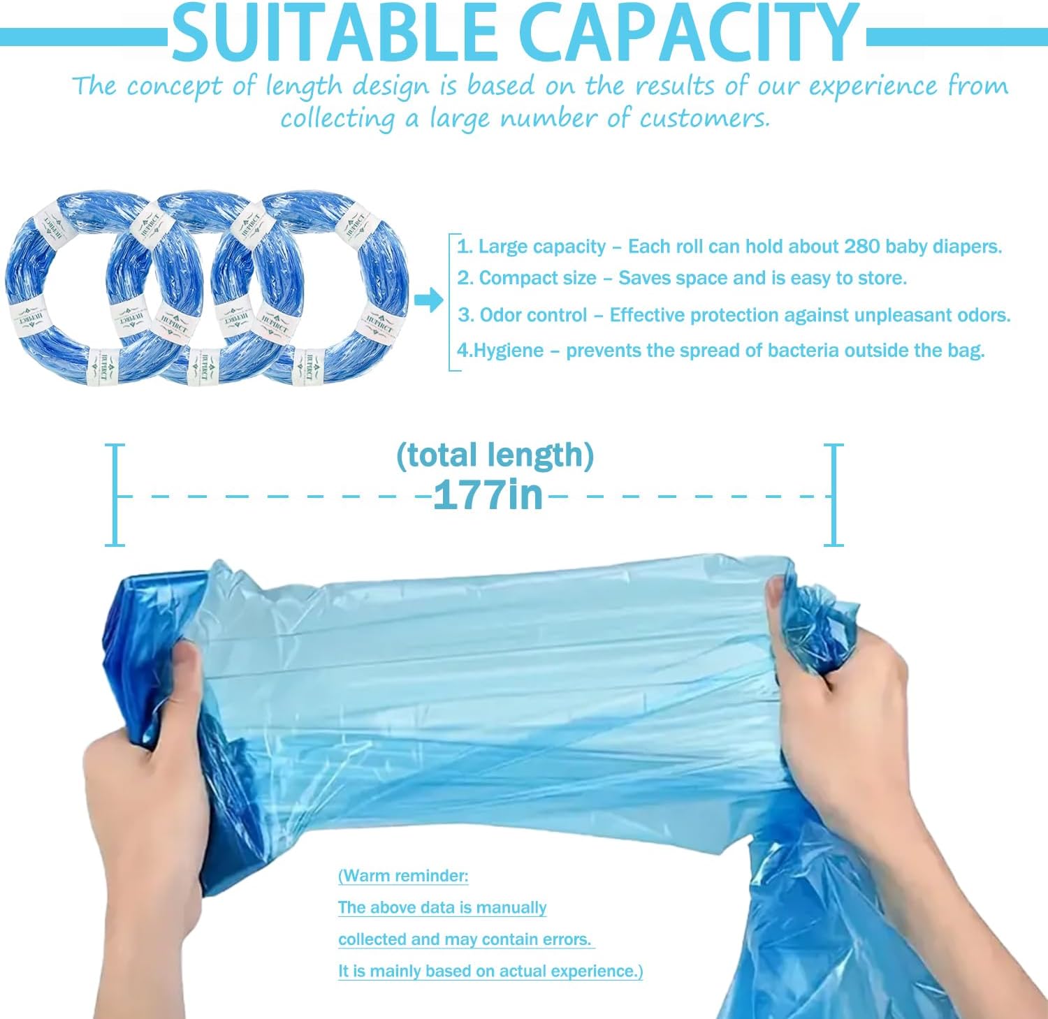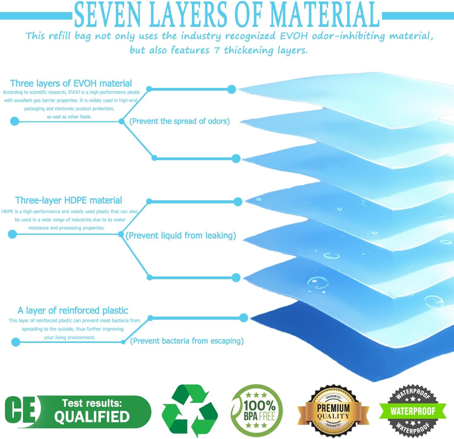 - 【SEVEN-LAYER MATERIAL + EVOH】: This diaper bucket refill bag is compatible with seven-in-one technology. The seven-layer material makes it stronger and more durable. You don't have to worry about it breaking during use. In addition, Evoh material is added. Evoh material is a recognized high barrier molecular material. Thanks to its strong barrier ability, it can perfectly and effectively isolate the spread of internal odors and further enhance the anti-odor function!