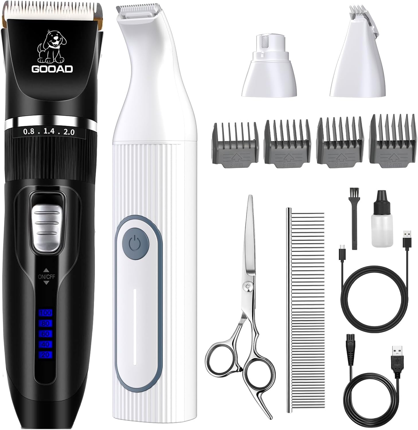- 【You Will Get】1 PC pet hair clipper, 1 PC pet paw trimmer, 1 PC small blade,1 PC 1 nail grinder head, 4 PCS limit combs, 1 PC pet steel comb, 1 PC scissors, 2 PCS chargers,1 PC cleaning brush, 1 PC oil.If you are looking for a pet grooming kit for your pet or a friend, then this will be the best and most complete set.