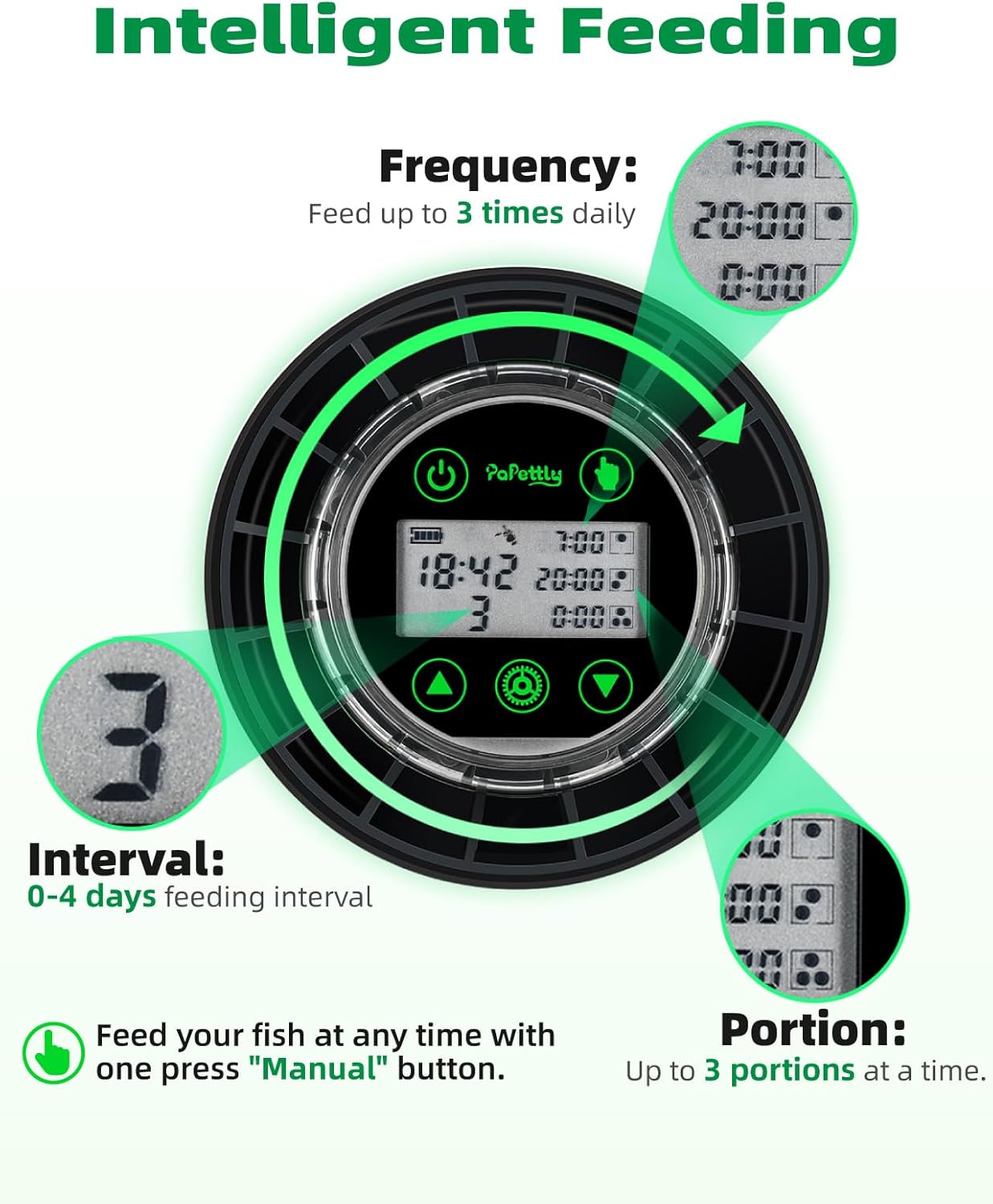 - Intelligent Programming: Enjoy the flexibility of scheduling up to 3 daily feedings with customizable frequencies and alternating day feedings, all effortlessly managed via the LCD display of our advanced automatic fish feeder