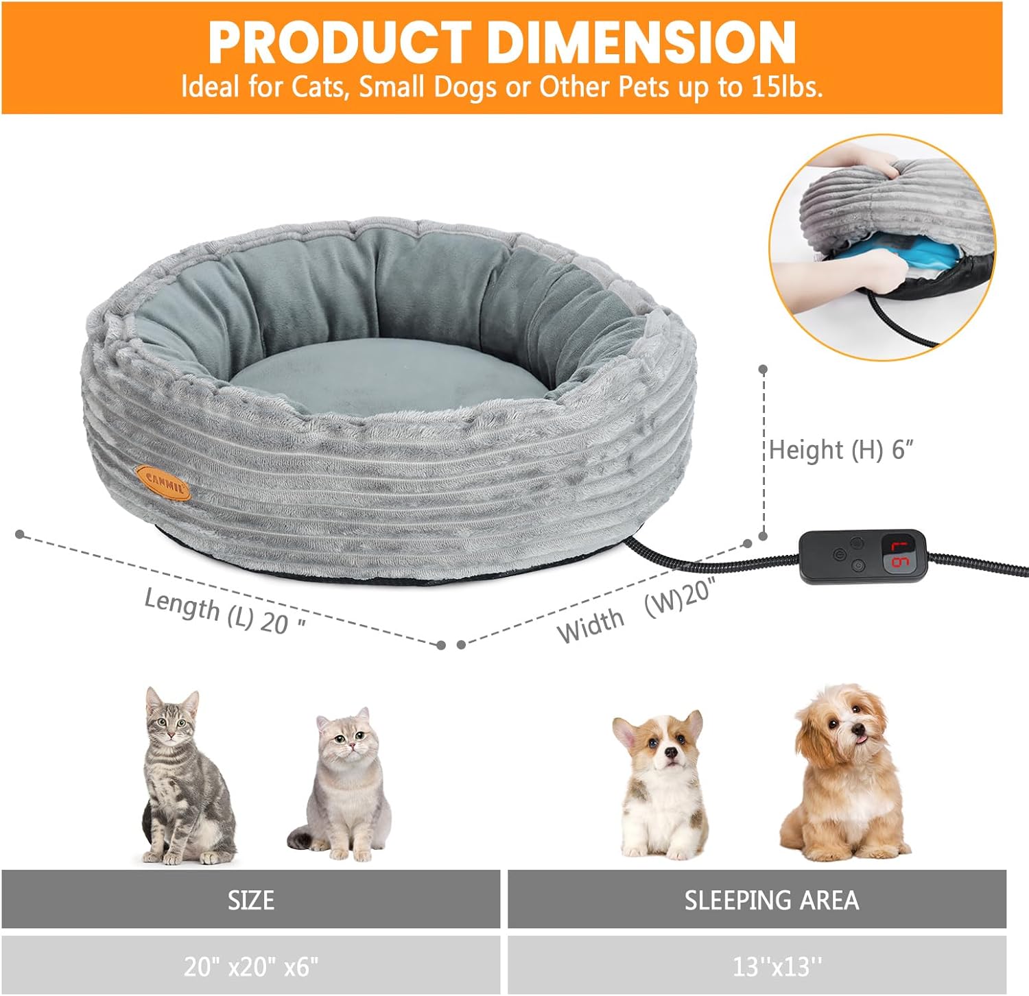 - Perfect Size for Small Pets: With a 20-inch diameter, this pet bed is the ideal size for cats, small dogs, and pets up to 15 lbs. The heating function is especially beneficial for senior cats, kittens, arthritic cats, and thin or hairless cats.
