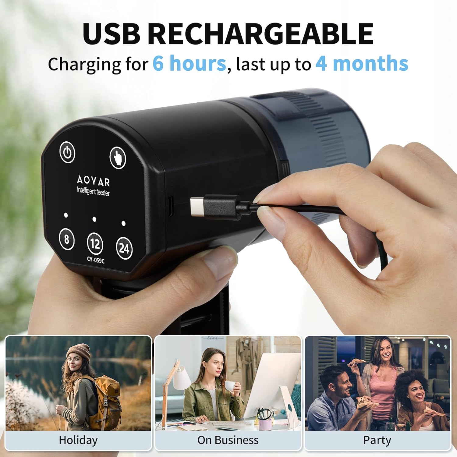 - 【USB Rechargeable】Automatic fish food dispenser is powered by USB cable,say goodbye to the trouble of "replacing battery".According to the number of feedings set,it can be used for 3-4 months once charge.Perfect fit for your vacation/weekends/Working.