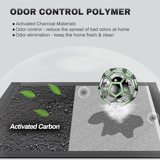 - Odor Control: The upgraded material with special charcoal in our pet training pads makes them more functional, to help eliminate and neutralize pee odors and keep your home fresh, clean, and odor-free.