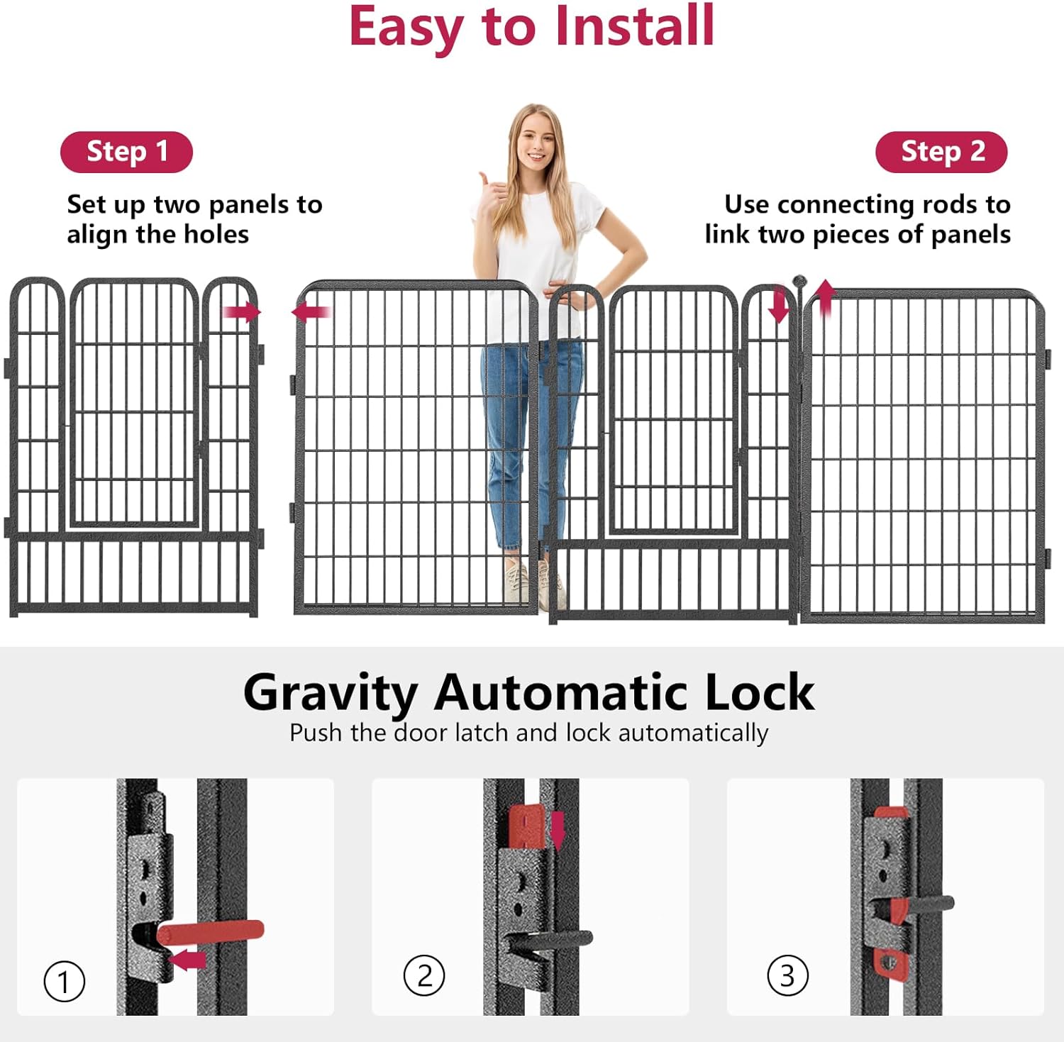 - 【Safe & Upgraded Design】: Jhsomdr puppy play pen upgraded with automatic door lock is firm and prevents pets from escaping; Metal round-top rods are designed round ball top and elongated bottom, effectively protecting pet claws, and pounded into the ground for greater stability. The bottom of our pet fence is designed with anti-slip foot pads and flat stakes, also suitable for indoor use without scratching indoor floor