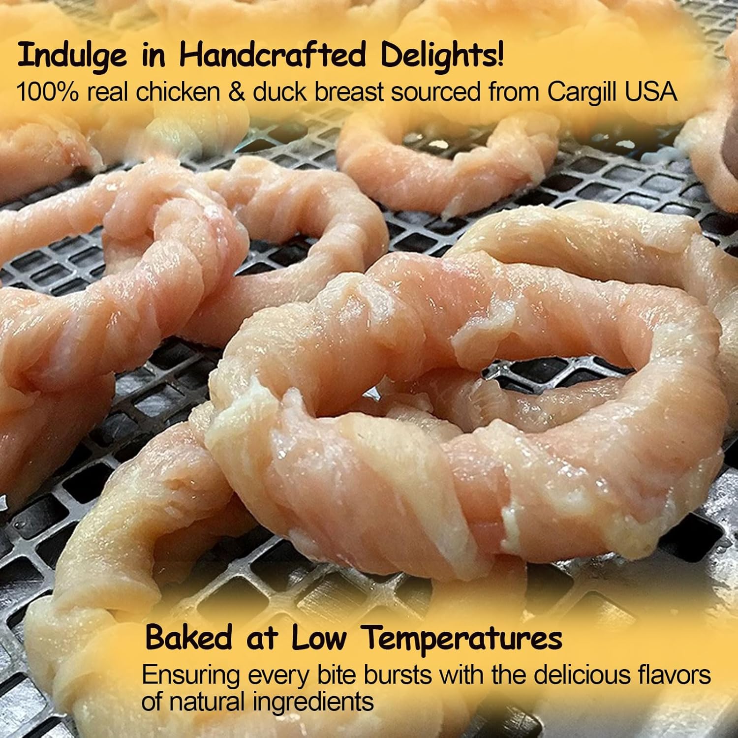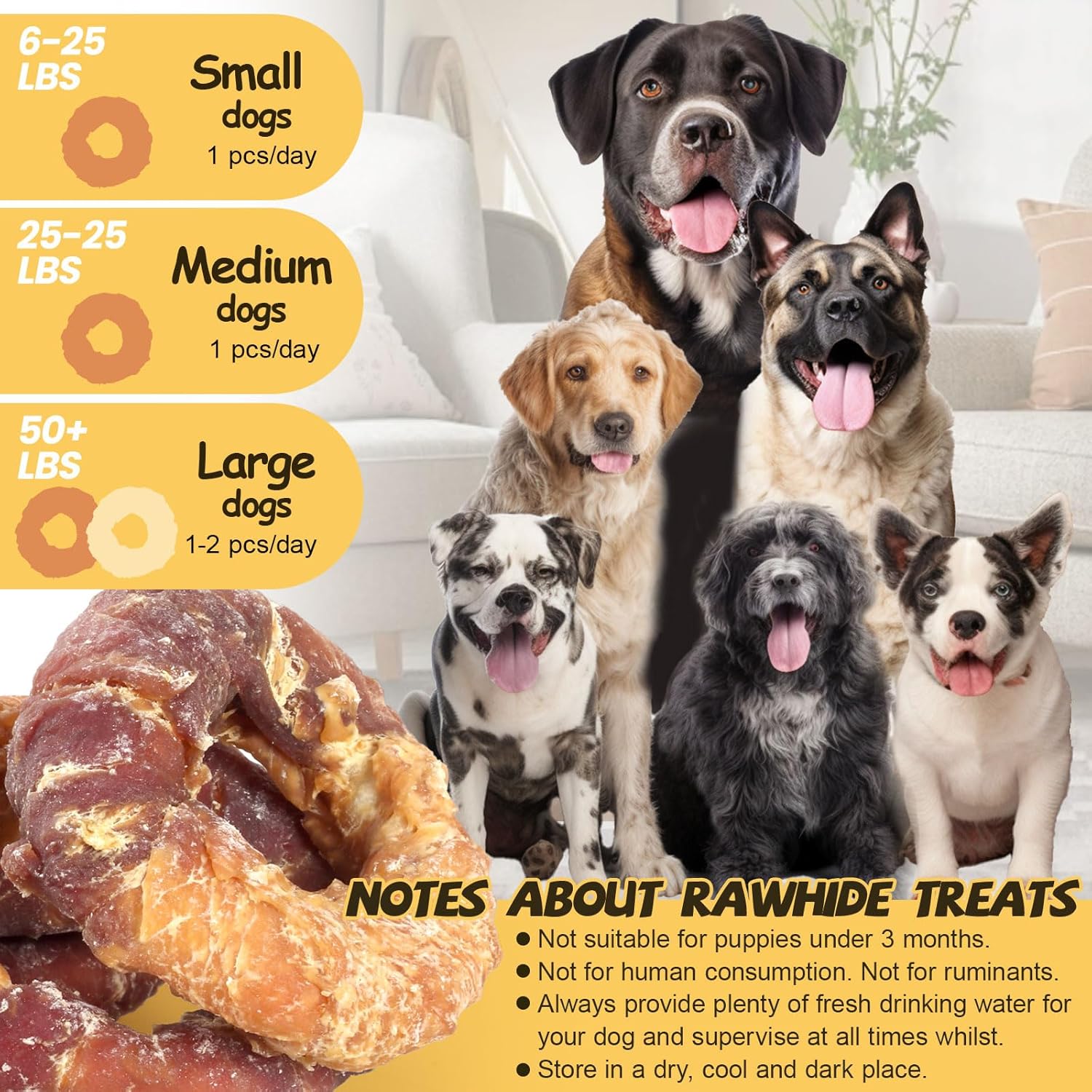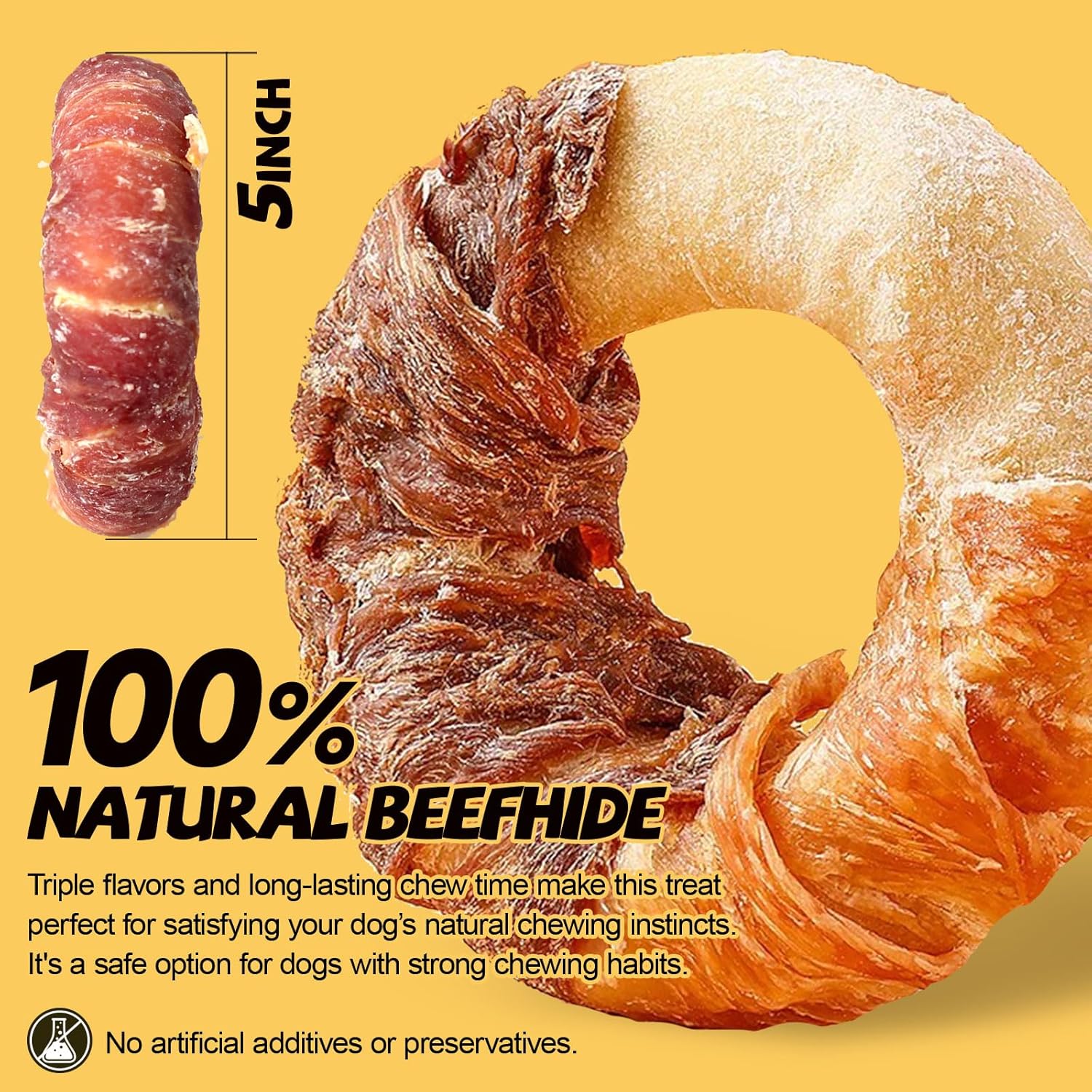 - DOG CHEWS LONG LASTING : Chicken & Duck Wrapped Rawhide Donuts allow a long-lasting and more fun chewing for your dogs. Approximately 4 inches large size with unique donut shape provides a satisfied chewing enjoyments with delicious tasting