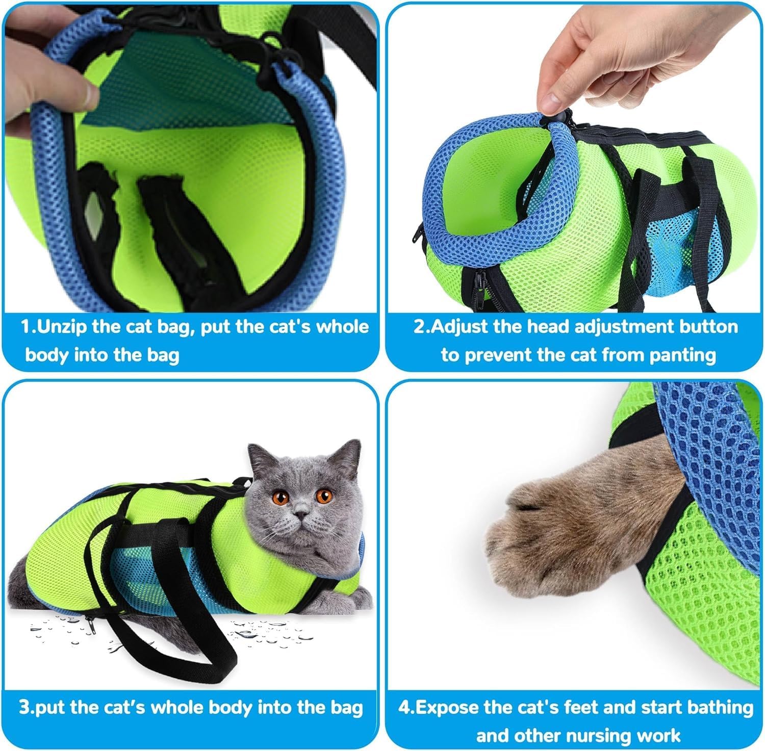 - [DRAWSTRING AND ZIPPERS DESIGN] Adopts two top zipper, two front zippers and two rear zippers design that it allows your cat to release 4 paws at a time, which makes it easy for you to trim cat's nails, and with 2 adjustable drawstrings for fixing your cat, preventing you from being bitten or scratched by your cats. Most important is that all the zippers have upgraded. The zippers can stay in place you want and you can keep the zippers zipped or unzipped during the bath.