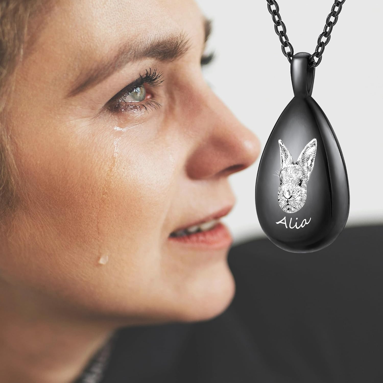 - Personalized Urn Necklace for Ashes: The perfect urn keepsake to have in loving memory of your favorite furry friend. Upload your beloved pet picture, enter your pet name and some meaningful date or words, you will get a custom teardrop urn necklace with a sketch-style pet portrait