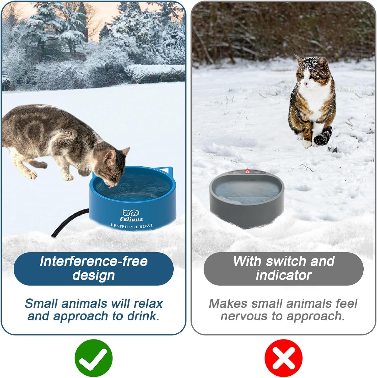- ๐๐ฒ๐ฒ๐ฝ ๐ช๐ฎ๐๐ฒ๐ฟ ๐ณ๐ฟ๐ผ๐บ ๐๐ฟ๐ฒ๐ฒ๐๐ถ๐ป๐ด - This heated water bowl for pets can prevent water from freezing in cold weather, it provides drinkable water for pet during the winter no matter what the weather. The method of use is very simple, plug it in and use it, after power on, the heated water will come on. The outdoor heated water bowls are perfect for dogs, stray cats, chickens, ducks, wild squirrels, rabbits, birds and so on.