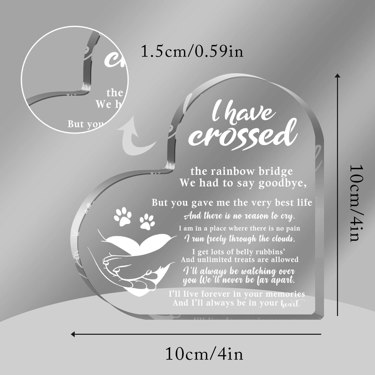 - Perfect size: This 4x4 inch heart-shaped acrylic piece is a touching tribute to beloved pets, designed to offer comfort and remembrance for those grieving the loss of a dog or cat.
