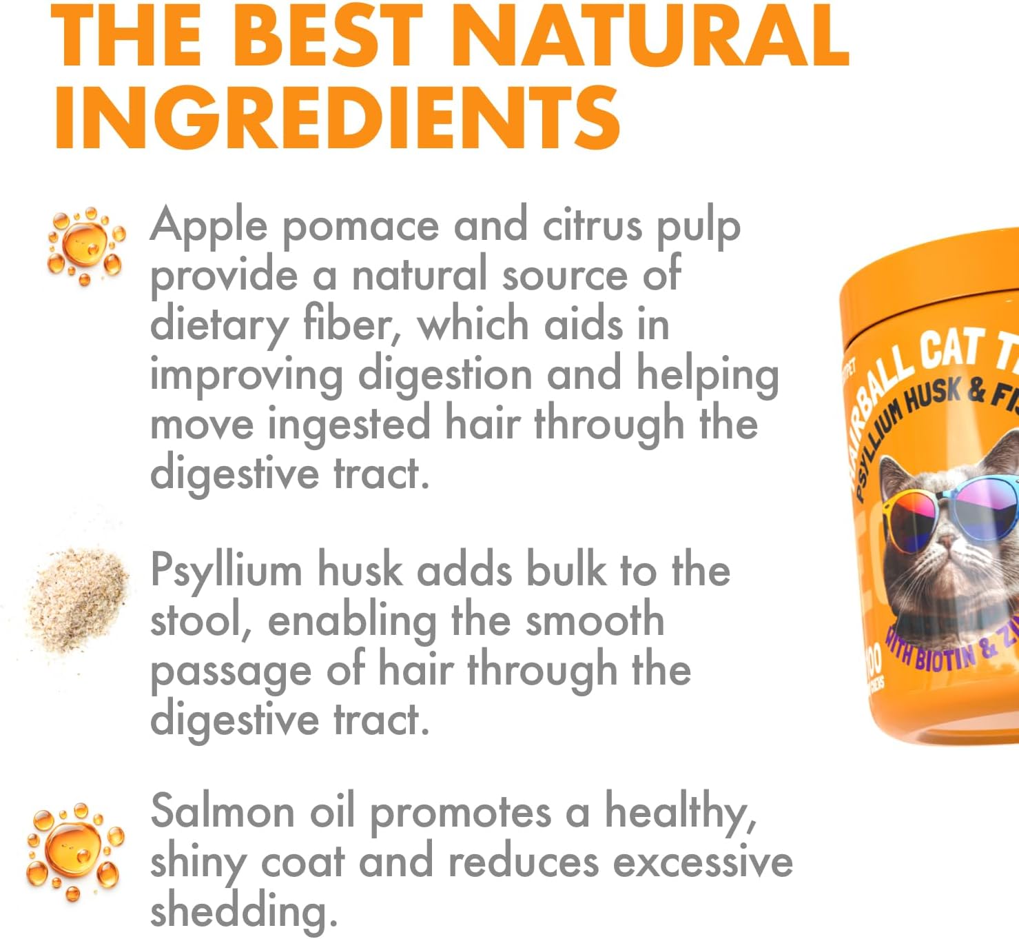 Hairball Treatment for Cats Natural Remedy with Apple Pomace, Psyllium Husk Omega 3 6 Fatty Acids Zinc Biotin Cat Supplement for Indoor Cats Promotes Healthy Digestion Furball Control 100 Yummy Chews