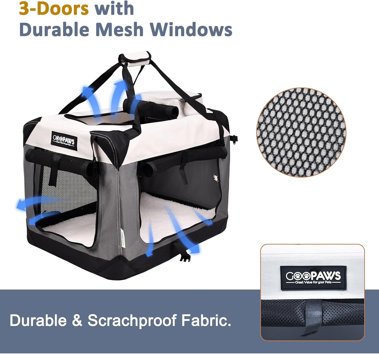 JESPET Soft Dog Crates Kennel for Pets, 3 Door Soft Sided Folding Travel Pet Carrier with Straps and Fleece Mat for Dogs, Cats(7-Light Grey, Large(30" L x 21" W x 23" H))