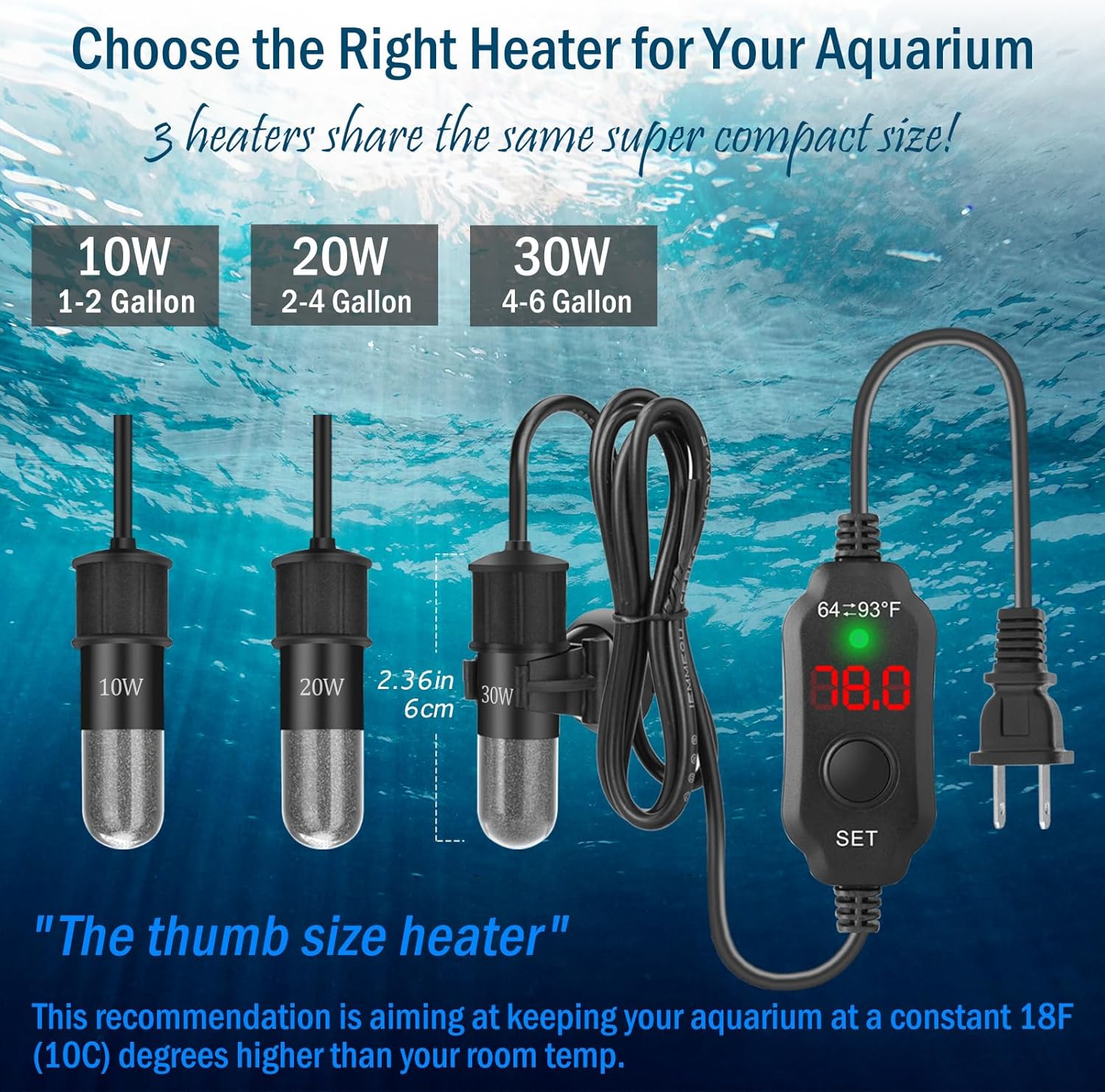 - SUPER MINI SIZE – This mini fish tank heater is just about the size of a thumb – only 2.36”(6cm) long. It's fantastic for nano tanks/betta tanks. The groundbreaking super tiny design brilliantly addresses the fish keepers' annoyance with traditional heaters! Occupies less space, easy to tuck away, but packs a punch in power! Temperature ranges between 64-93F, suitable for 4-6 Gallon tanks.