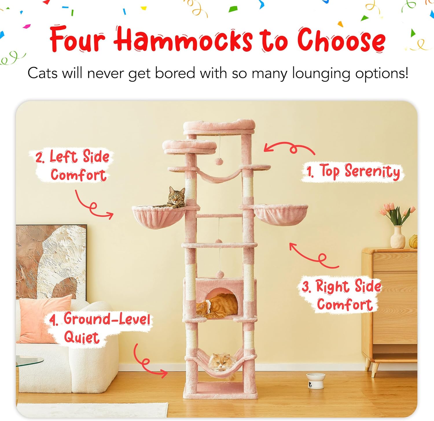 77-Inch Pink Cat Tree for Indoor Cats, Multi-Level Large Cat Tower with 4 Hammocks, 2 Padded Perches, Cat Condo, Sisal Scratching Posts and Hanging Toys for Large Adult Cat