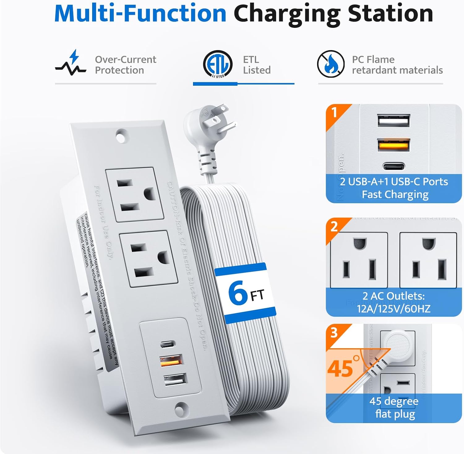 - Furniture-Mounted Outlet: Our fast-charging recessed power strip featuring USB-C is ETL-certified, ensuring safety. Its fire-resistant casing and integrated safety system offer 600J surge protection, safeguarding your devices overnight and enhancing charging safety.