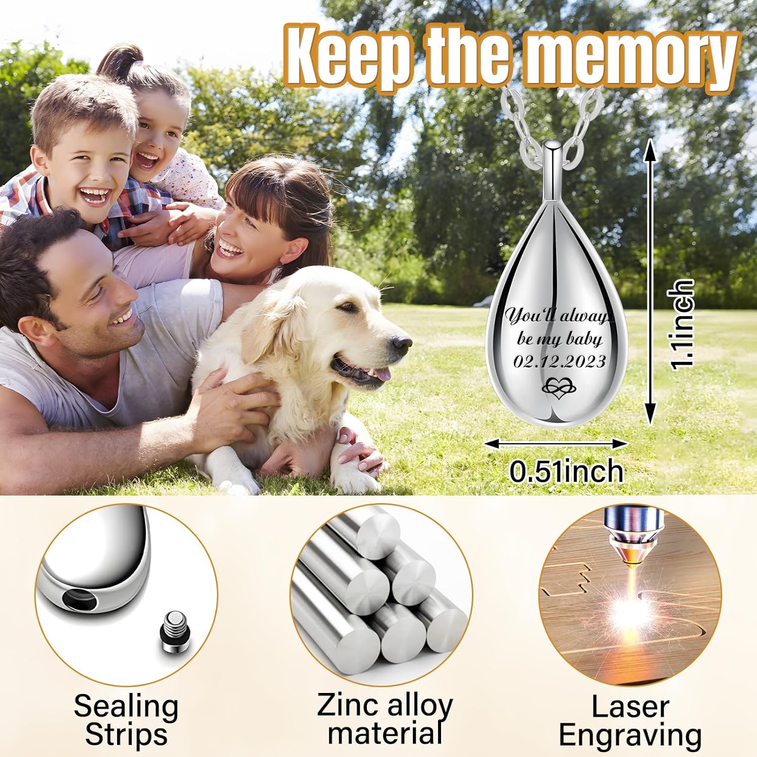 - Jewelry for Ashes of Loved Ones:Laser engraving and thermal transfer technology are used to print color photos. The surface is coated with a scratch-resistant resin to ensure that the pictures will not fall off or get scratched, so that your pets, loved ones and family members can always be with you or your family