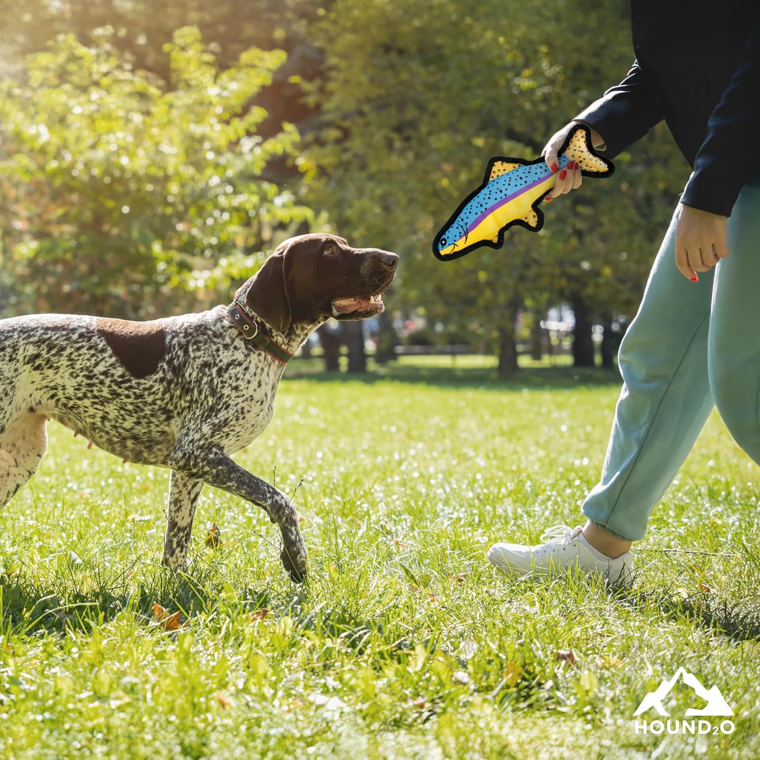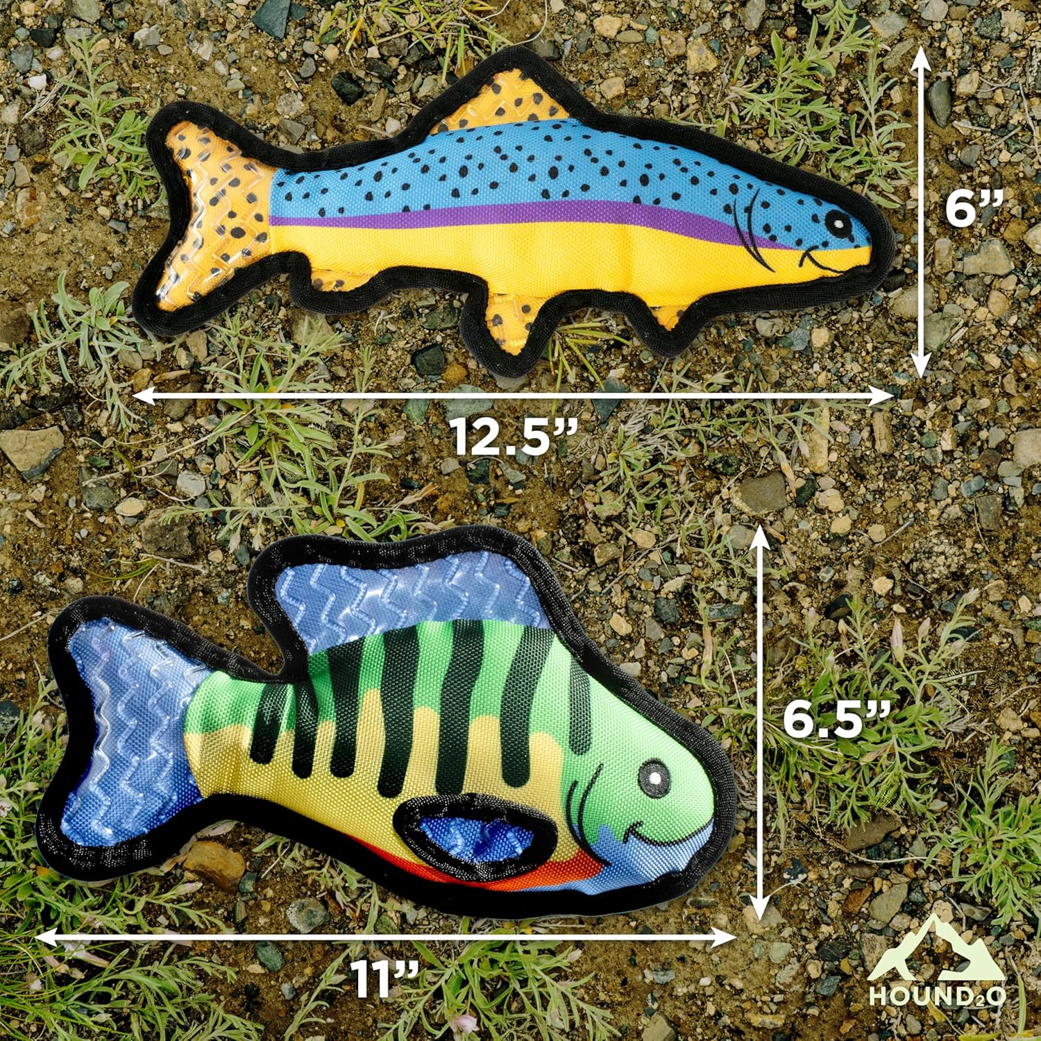 - Hound2O’s Bluegill & Trout Plush 2-Pack – Double the fun with this 2-pack of lifelike, plush fish toys made from rip-resistant ballistic nylon. Each plush features raised TPR details and a squeaker designed to last through all the wrestling and chewing. The perfect catch for hounds of all sizes who love a nearby fishing adventure!
