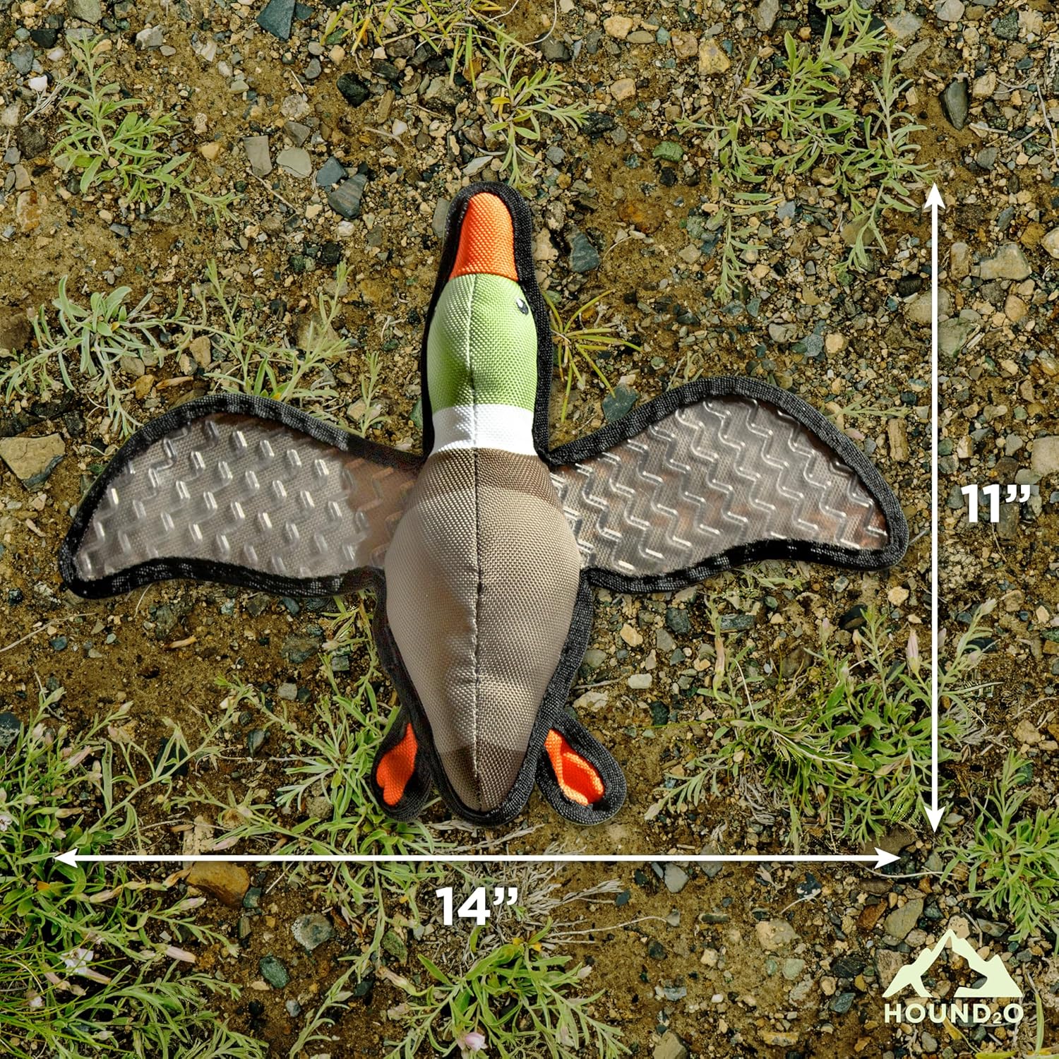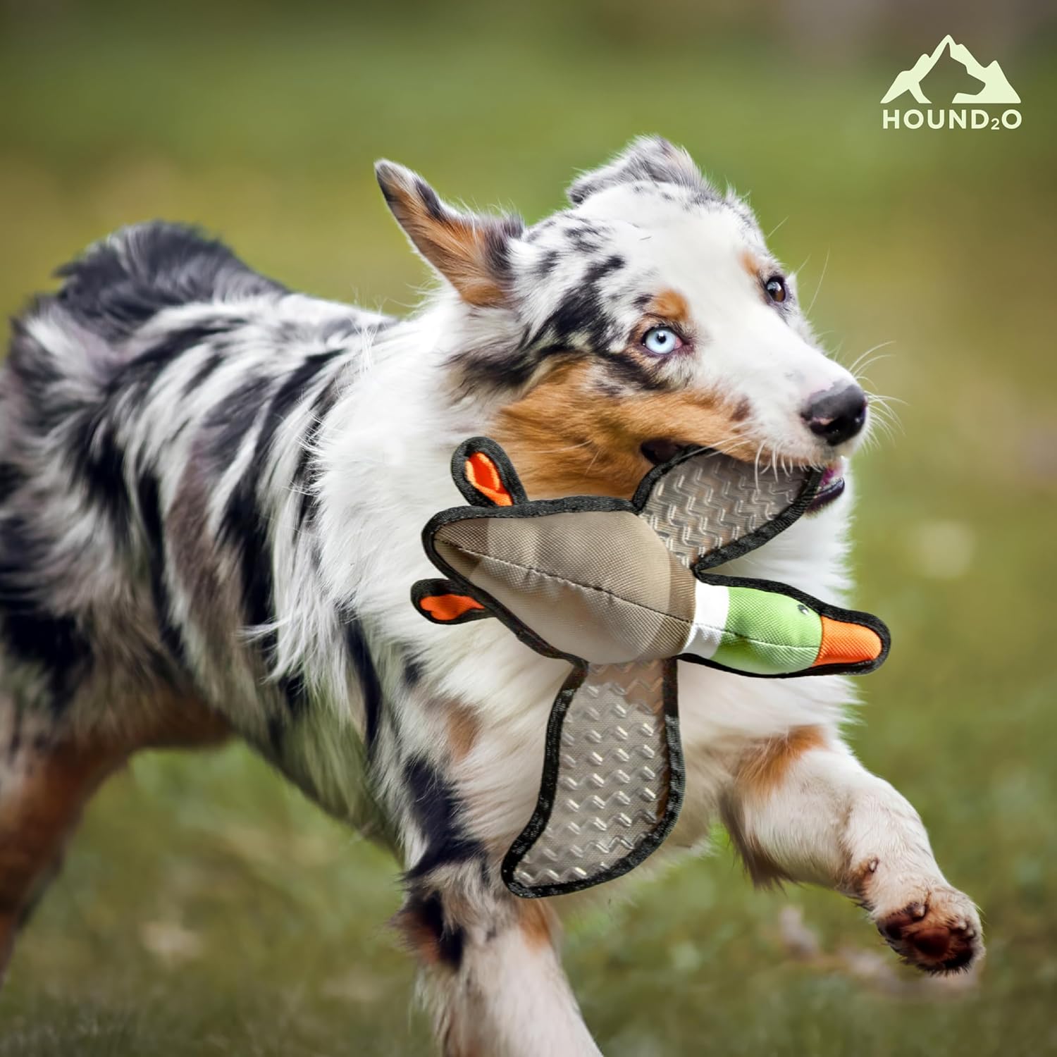 - Hound2O’s Flying Duck Plush – Take your dog’s playtime to new heights with this lifelike duck plush made from ballistic nylon. Designed with raised TPR features for extra texture and an exciting chuckler sound, it’s perfect for hounds of all sizes who love to chase and wrestle with their winged prey!
