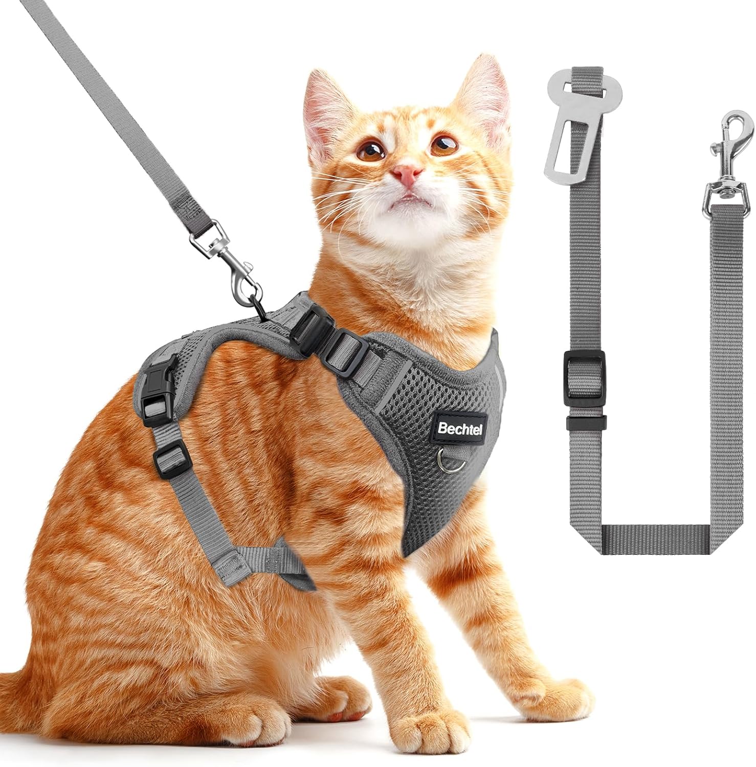 Cat Harness and Leash Set for Walking Escape Proof, Adjustable Soft Kittens Vest with Reflective Strip for Cats, Comfortable Outdoor Vest, Cat Car Leash, Grey, S