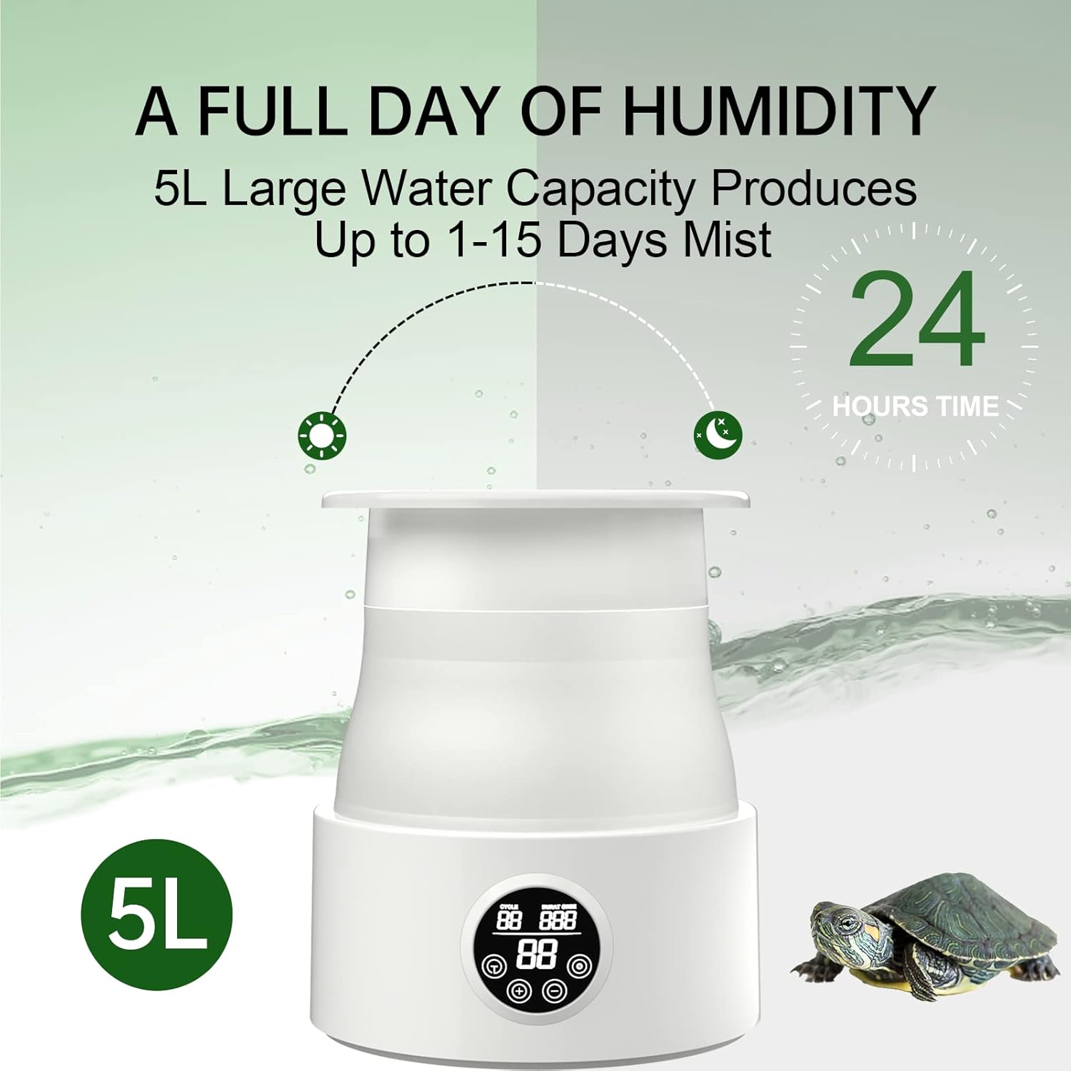 - 【5L Large Tank & Foldable】 The misting system for reptiles comes with a 5L water tank, allowing for up to 15 days of continuous use. The water tank features a foldable design, optimizing space and facilitating easy storage and portability.