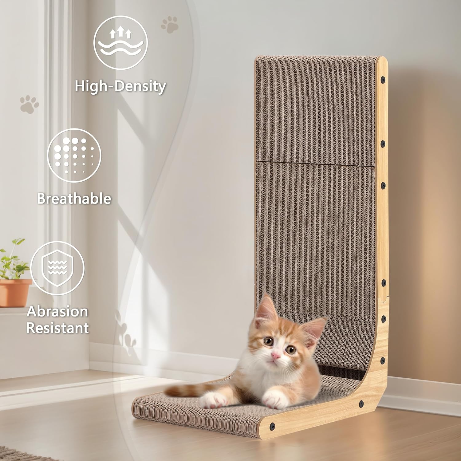 - Designed with a sleek, modern look available in neutral tones, this cat scratcher seamlessly blends into your home decor instead of looking like an eyesore. It serves not only as a functional pet accessory but also as a subtle decorative piece, making it a great addition to any room, from the living room to the bedroom.