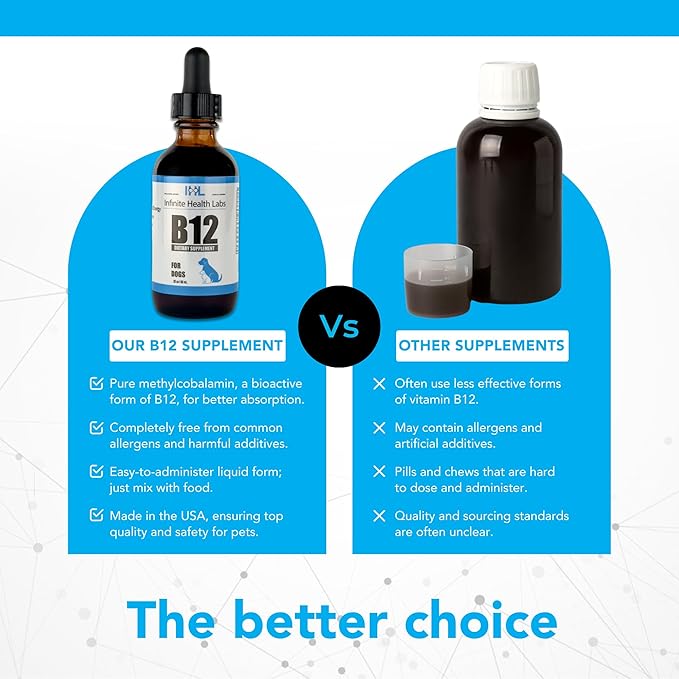 - Potent formula: Our formula contains 2,500 mcg/mL of methylcobalamin, the bioactive form of B12 that's easily absorbed by your furry friend's body. This cobalamin b12 for dogs ensures maximum effectiveness, supporting your dog's health with every dose. (230 characters)