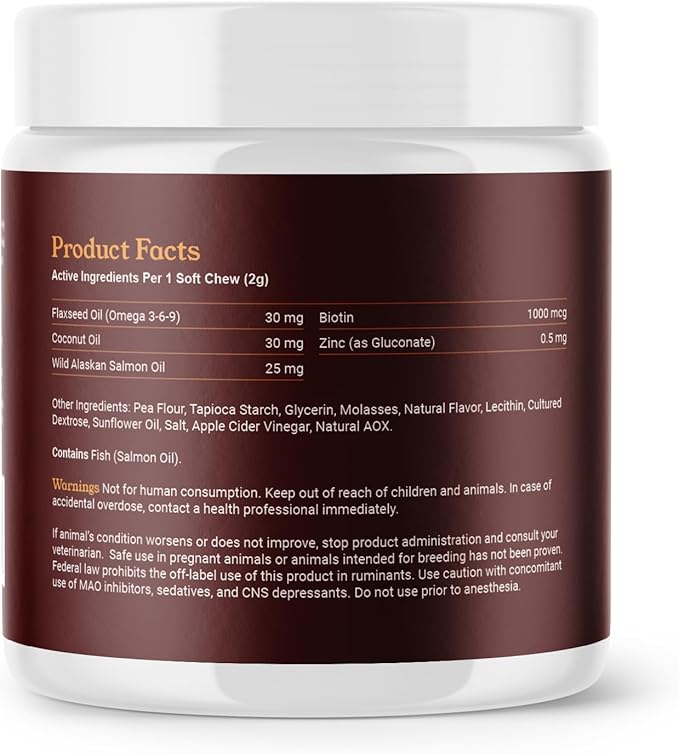 - Formulated with Salmon Oil and Zinc Gluconate, known for helping maintain coat appearance.